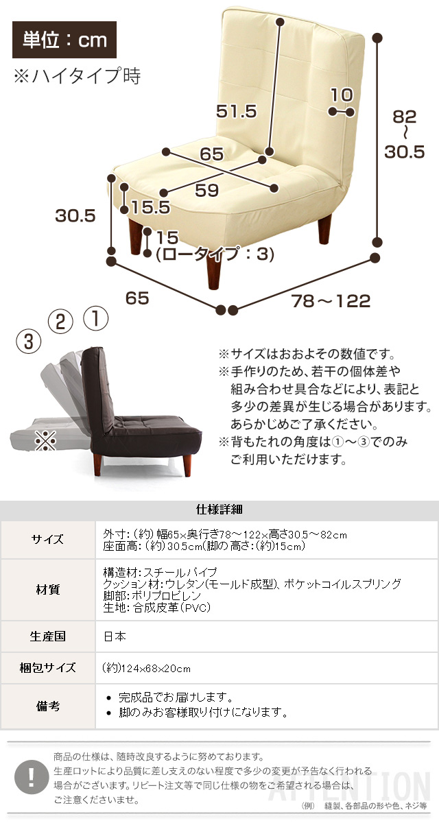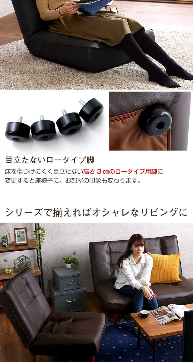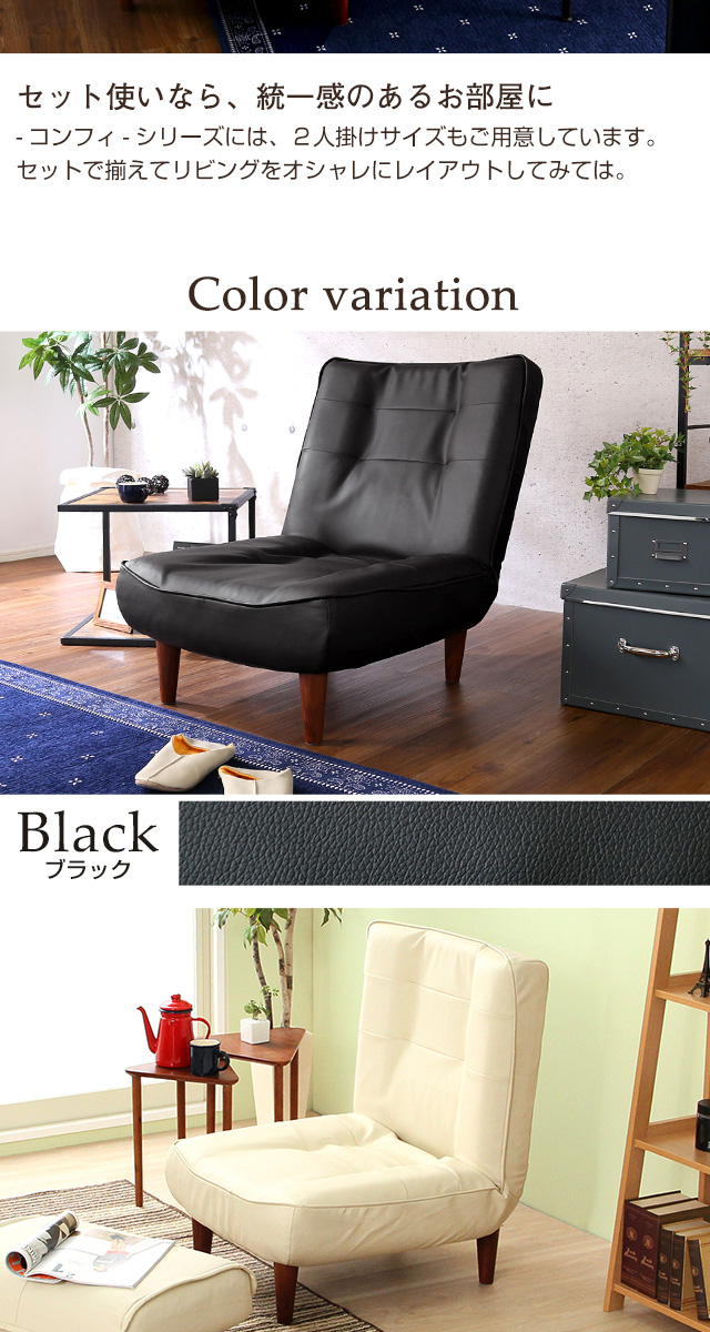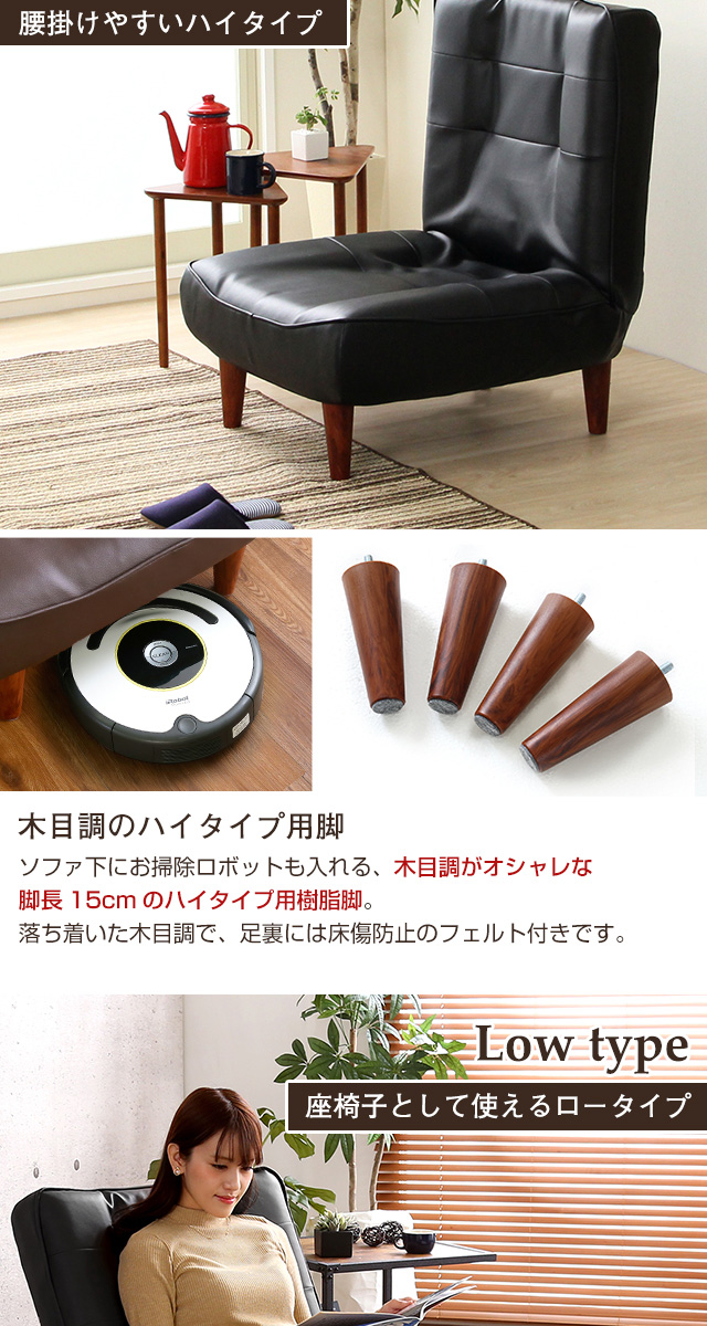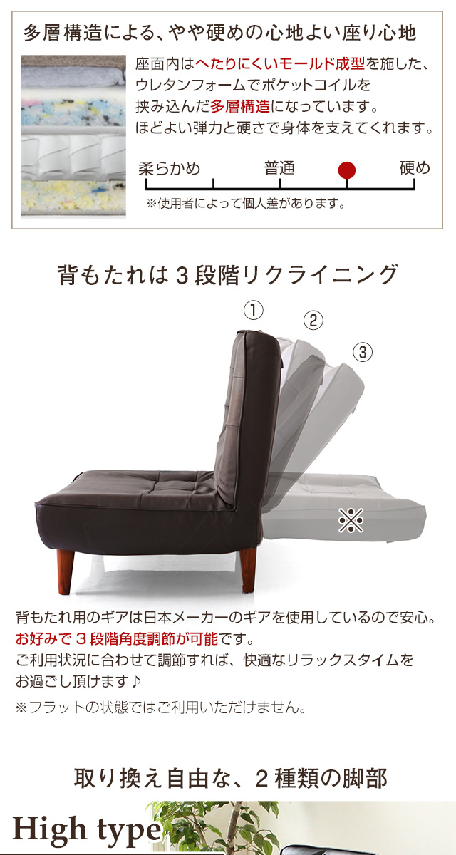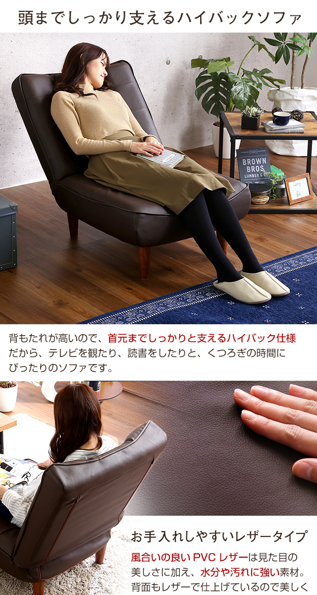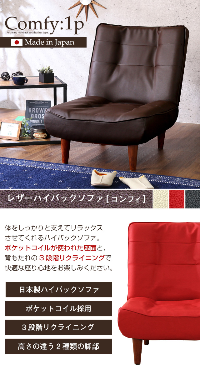 1人掛ハイバックソファ(PVCレザー)ローソファにも、ポケットコイル使用、3段階リクライニング 日本製|Comfy-コンフィ-[ブラウン]