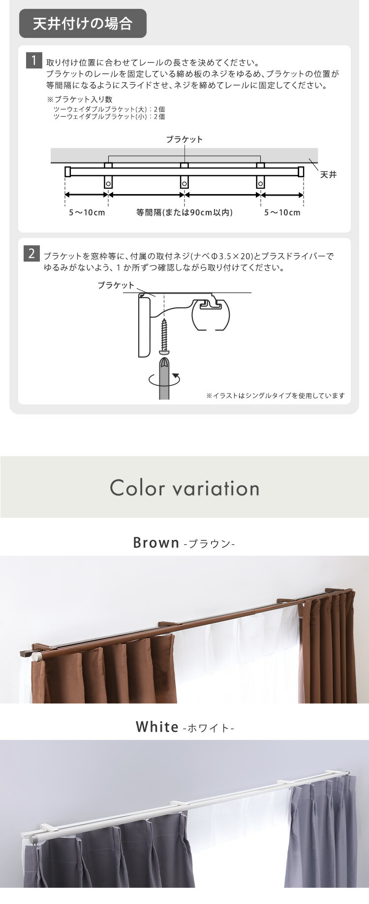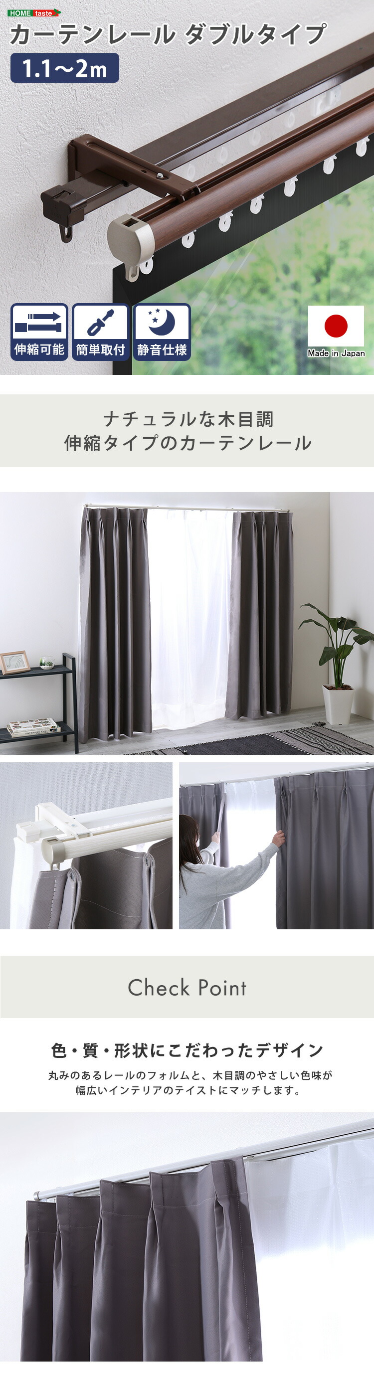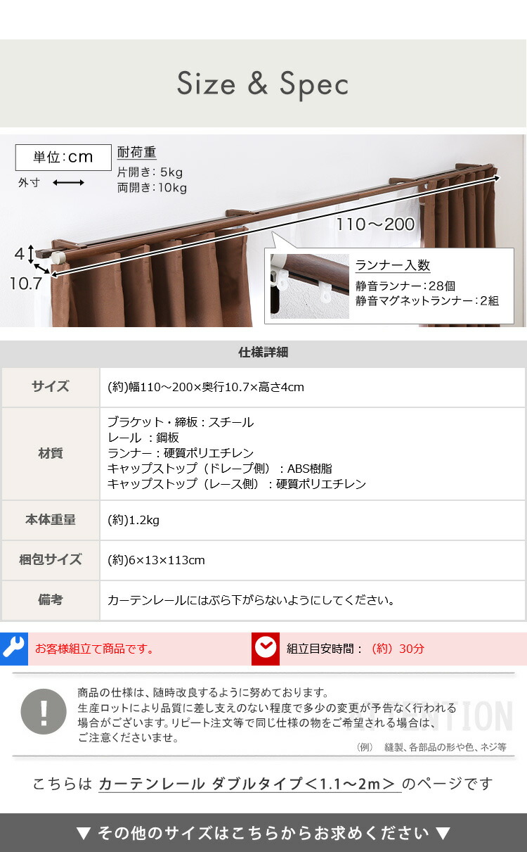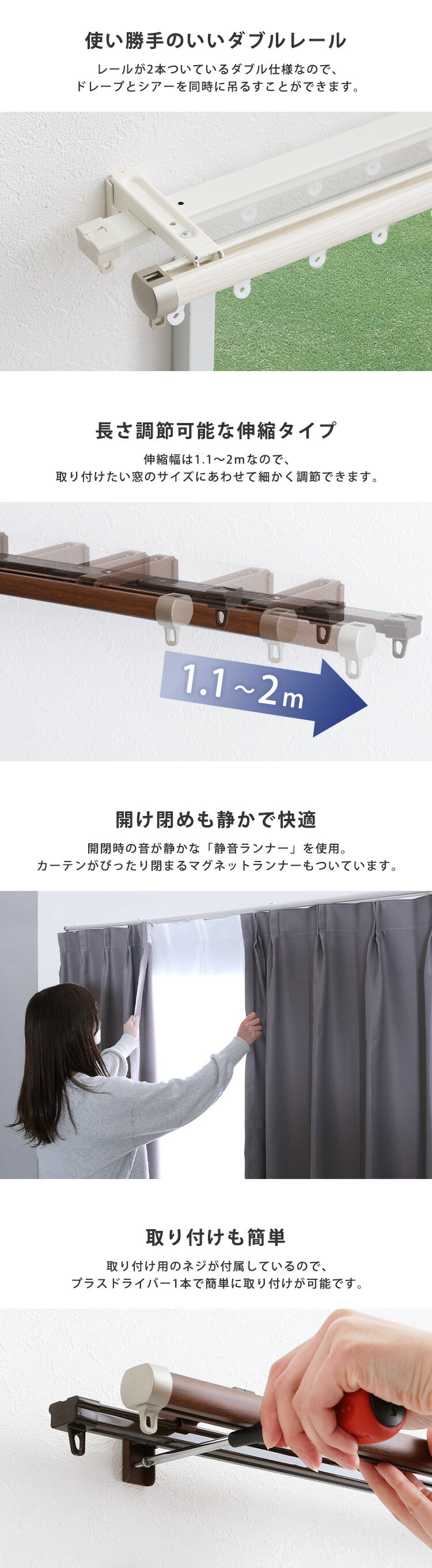 カーテンレール ダブル 1.1~2m 伸縮 静音 日本製 ダブルレール 【代引不可】[ブラウン]