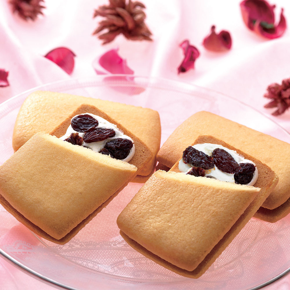 洋酒の香りをまとったレーズンを、上品な甘さの特製クリームとサンドしました。なめらかなクリームと香り豊かなレーズンのハーモニーをお楽しみください。