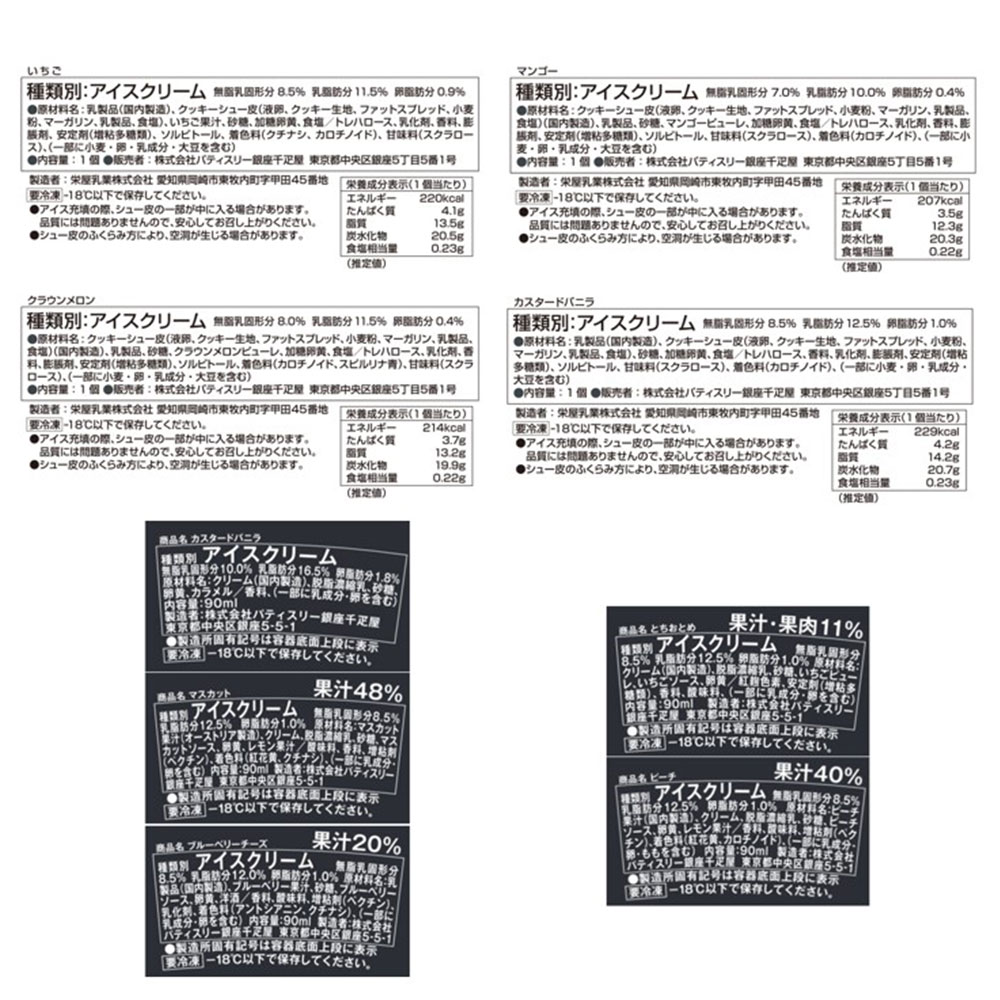 ■規格:プレミアムアイス(カスタードバニラ・とちおとめ・マスカット・ピーチ・ブルーベリーチーズ)各90ml×各1、プレミアムシューアイス(いちご・クラウンメロン・マンゴー・カスタードバニラ)×各1