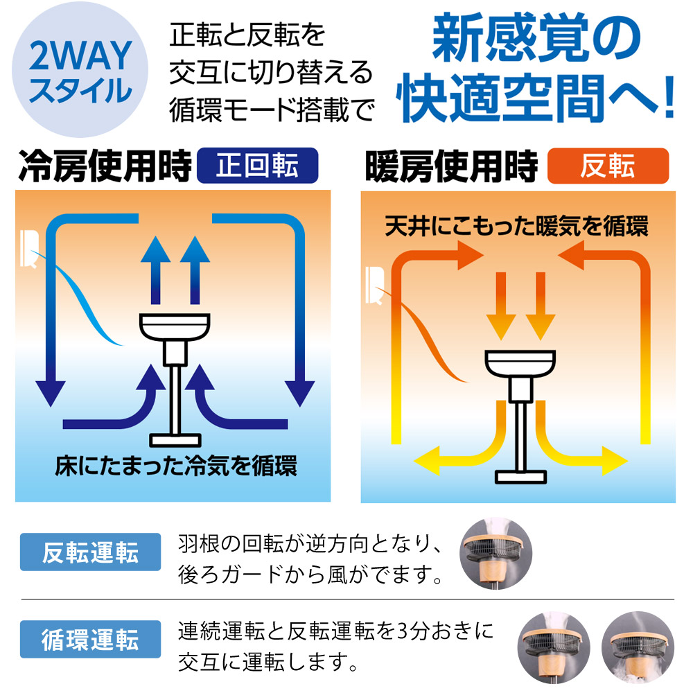 涼しんだり、お部屋の換気をしたり、エアコンの冷気や暖房の暖気を効率的に空気循環したりすることが可能な「逆回転機能」搭載モデルとなります。