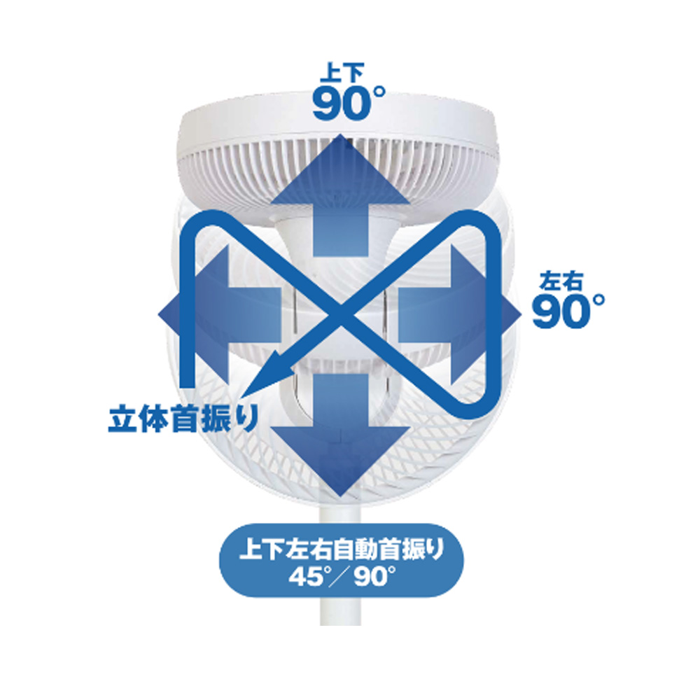 左右自動首振り機能(45°/90°)と上下自動角度調節(45°/90°)が可能で、効率性能も非常に高くなります。