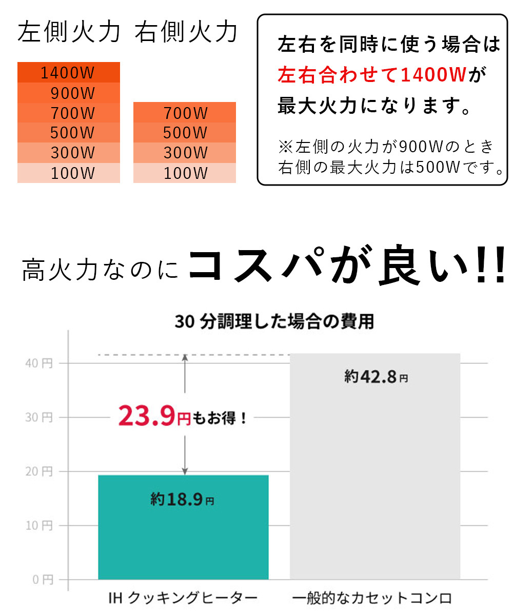 左ヒーター:200W相当/400W/700W/1000W/1400W(5段階)