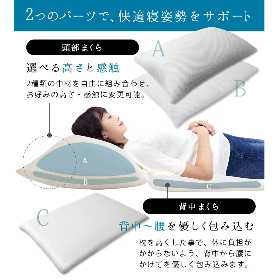 2種類の中材を自由に組み合わせ、お好みの高さ・感触に変更可能。