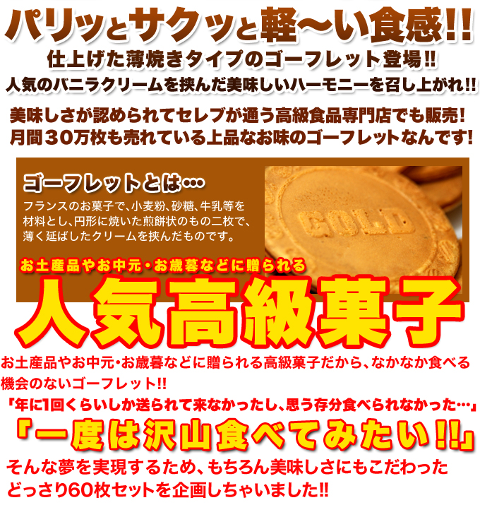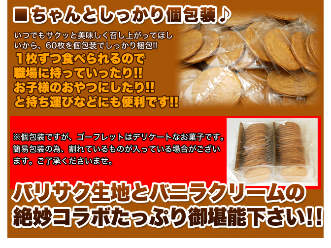 【訳あり】バニラ☆ゴーフレット60枚入り 洋菓子 焼菓子 ゴーフル ゴーフレット どっさり 大容量 お徳用 訳あり 高級 個包装 バニラ 家庭用 スイーツ SM00010013 【代引不可】