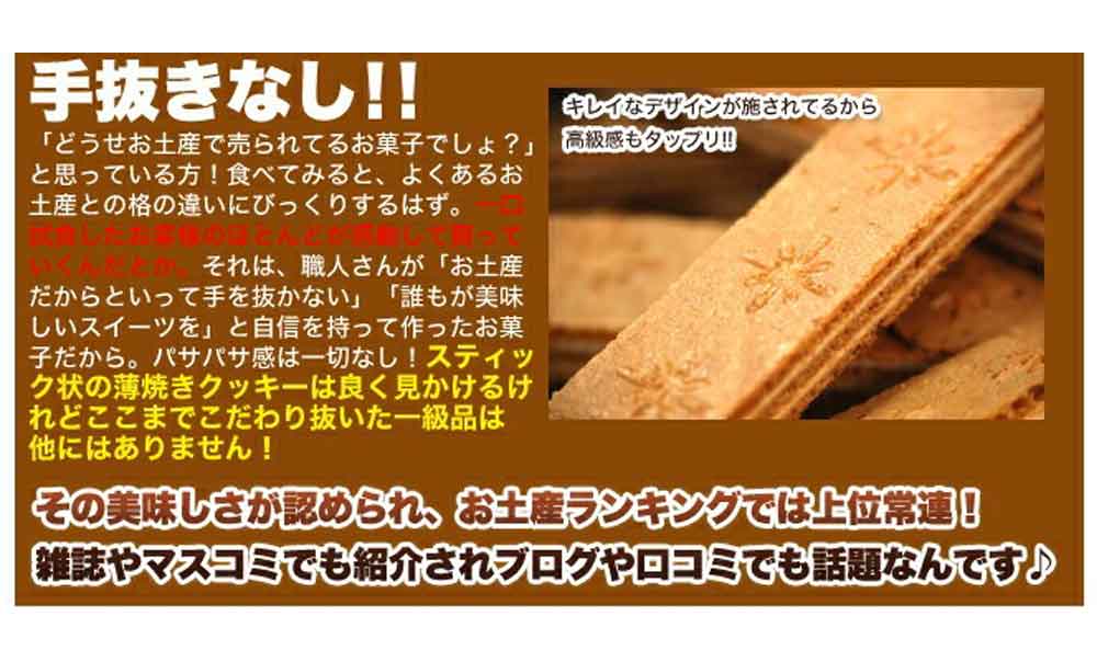 パサパサ感は一切なし!スティック状の薄焼きクッキーは良く見かけるけれどここまでこだわりぬいた一級品は他にはありません!