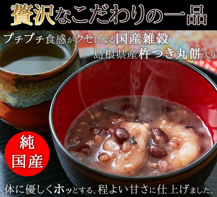 検索キーワード: ぜんざい 餅入り もち入り 国産雑穀 添加物不使用 レトルト おしるこ お汁粉 餅入りぜんざい 甘い 誕生日 父の日 母の日 敬老の日 景品 賞品 粗品 新歓 歓迎 送迎 新年会 忘年会 景品 プチギフトお土産 ギフト プレゼント