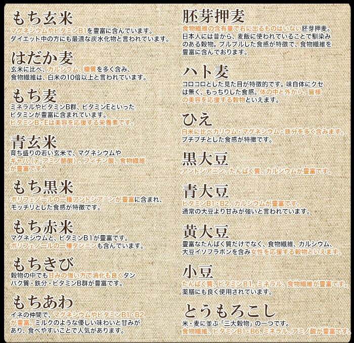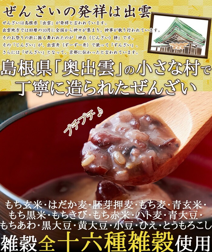 ■原材料名:餅米(島根県産)、砂糖(甜菜)、小豆(島根県産)、十六種雑穀ミックス(もち玄米、はだか麦、胚芽押麦、もち麦、青玄米、もち黒米、もちきび、もち赤米、ハト麦、青大豆、もちあわ、黒大豆、黄大豆、小豆、ひえ、とうもろこし)、食塩