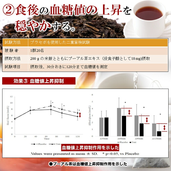 プ―アール茶由来没食子酸には、食事の時の糖の吸収を抑え、食後の血糖値の上昇を穏やかにする機能や、肥満気味な方の体脂肪(内臓脂肪)とBMIを減らす機能のあることが報告されています。