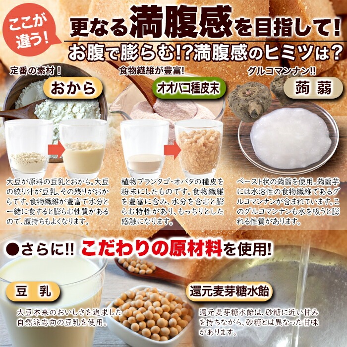 ■原材料名:還元麦芽糖水飴(タイ製造)、おから(大豆を含む)、食用菜種油、豆乳、コーンスターチ、こんにゃく、オオバコ種皮末/ベーキングパウダー