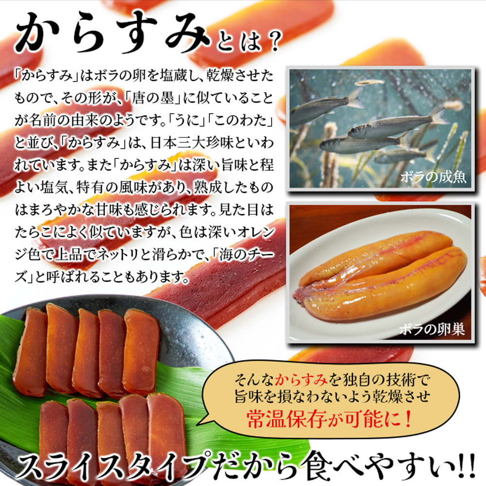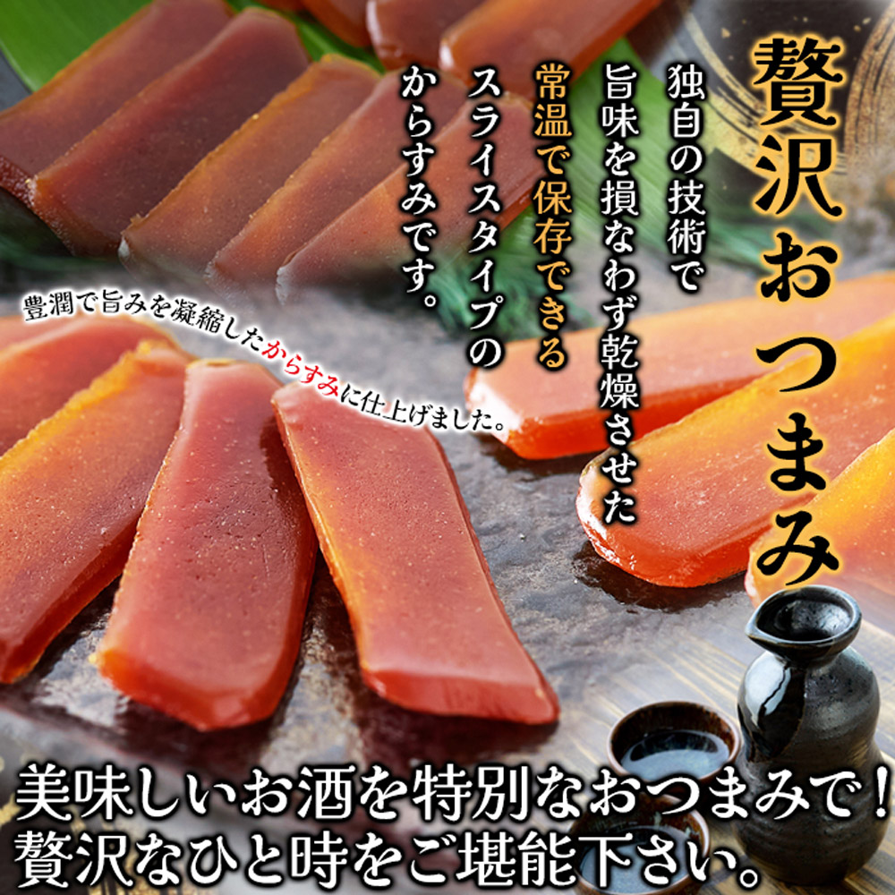 独自の技術で旨味を損なわず乾燥させた常温で保存できるスライスタイプのからすみです。