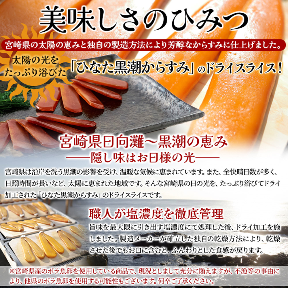 宮崎県は沿岸を洗う黒潮の影響を受け、温暖な気候に恵まれています。また、全快晴日数が多く、日照時間が長いなど、太陽に恵まれた地域です。そんな宮崎県の日の光を、たっぷり浴びてドライ加工された「ひなた黒潮からすみ」のドライスライスです。
