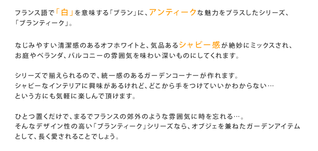 そんなデザイン性の高い「ブランティーク」シリーズなら、オブジェを兼ねたガーデンアイテムとして長く愛されることでしょう。