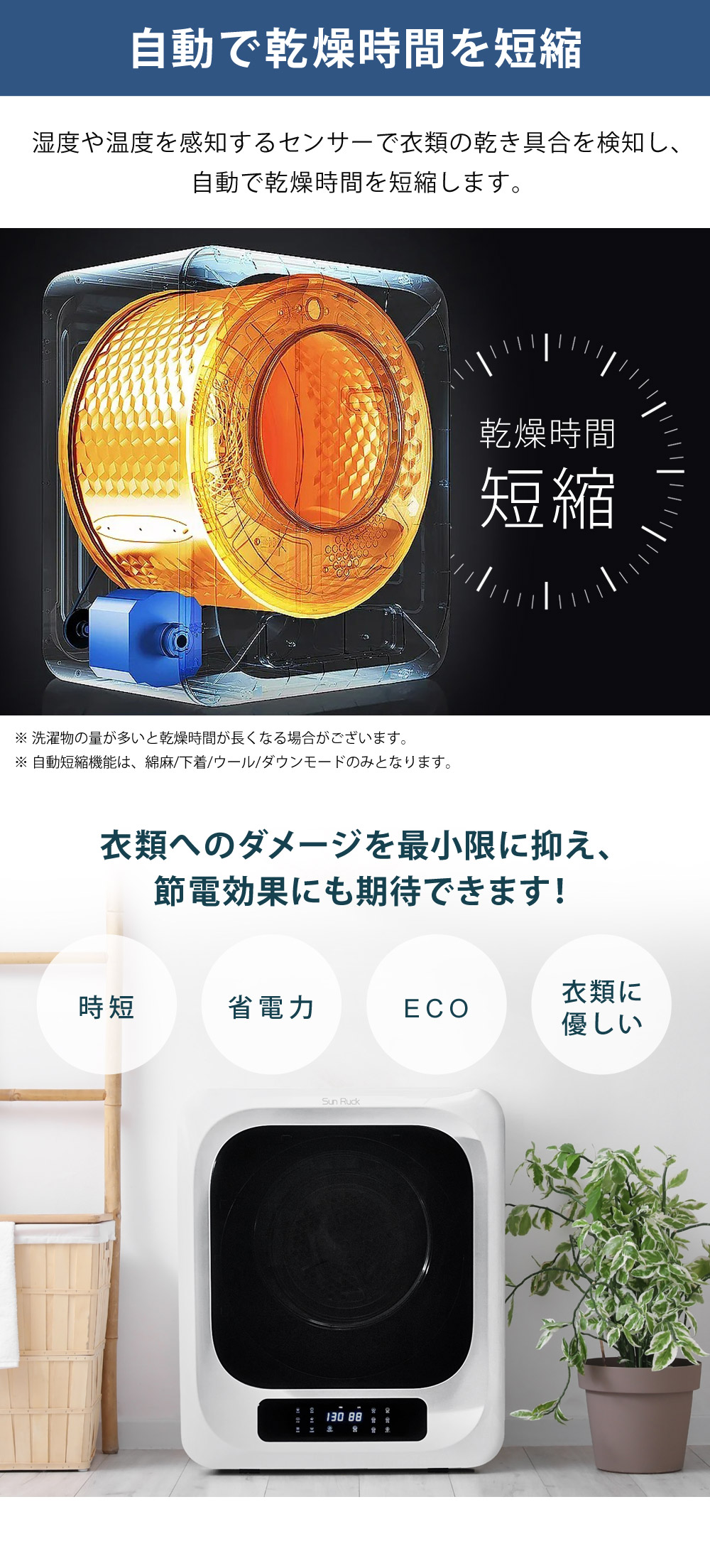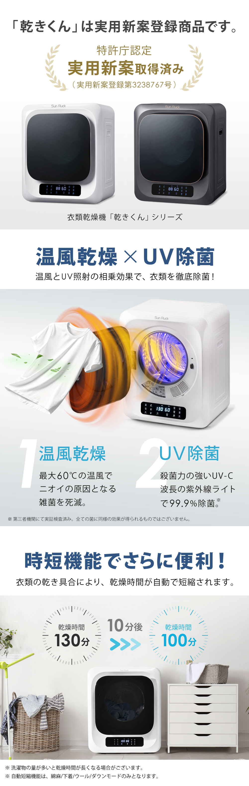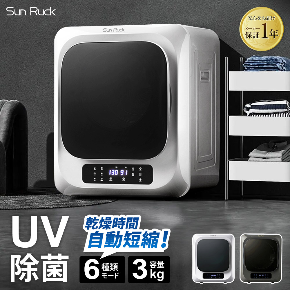 衣類乾燥機 小型 3kg UV除菌 脱臭 自動短縮機能 工事不要 タッチパネル 静音 ドラム式 タイマー 絡まり防止 小型衣類乾燥機 大容量 家庭用 洗濯物 子供服 タオル シャツ ダウン 高温 乾燥 梅雨対策 新生活 SunRuck サンルック SR-ASMN206 乾きくん[ホワイト]