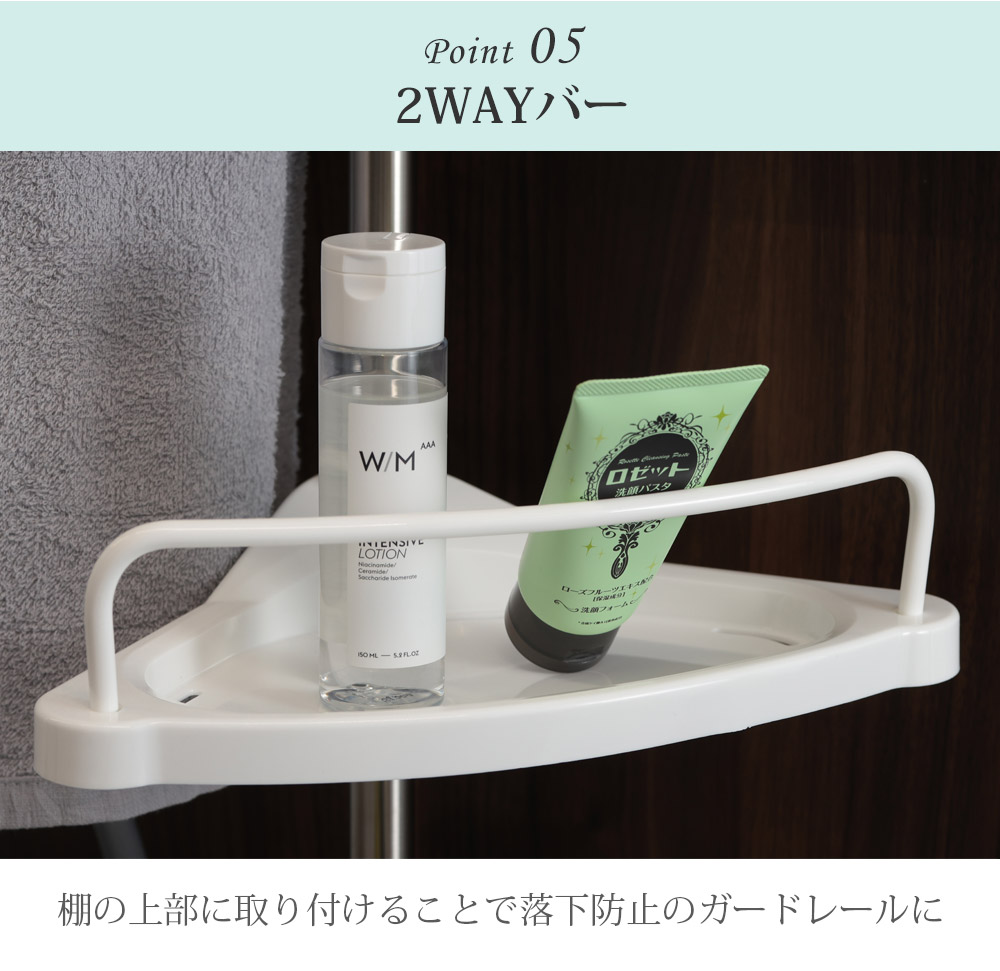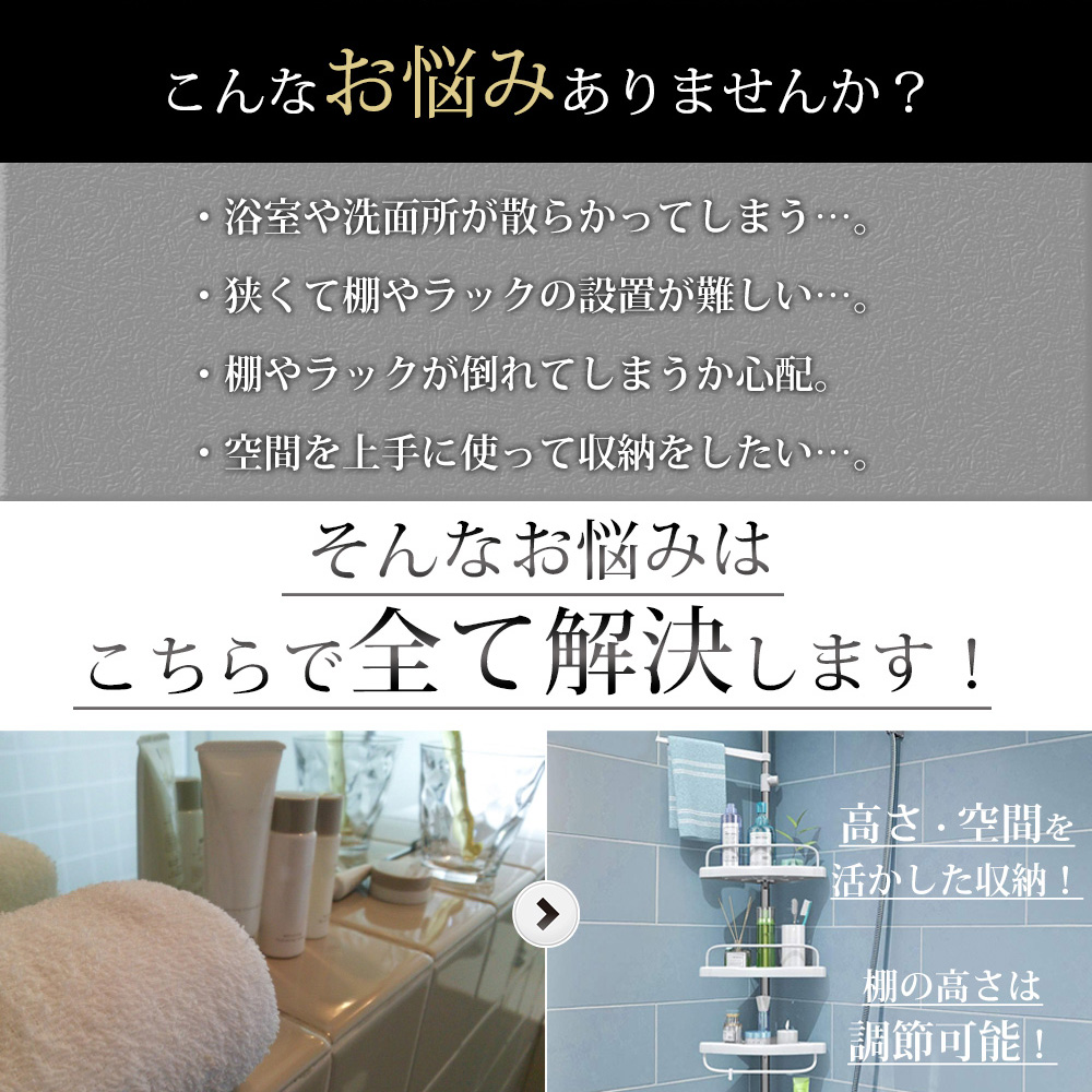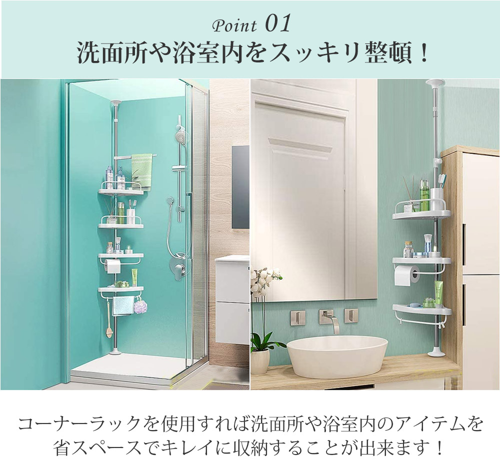 コーナーラックを使用すれば洗面所や浴室内のアイテムを省スペースでキレイに収納することが出来ます!