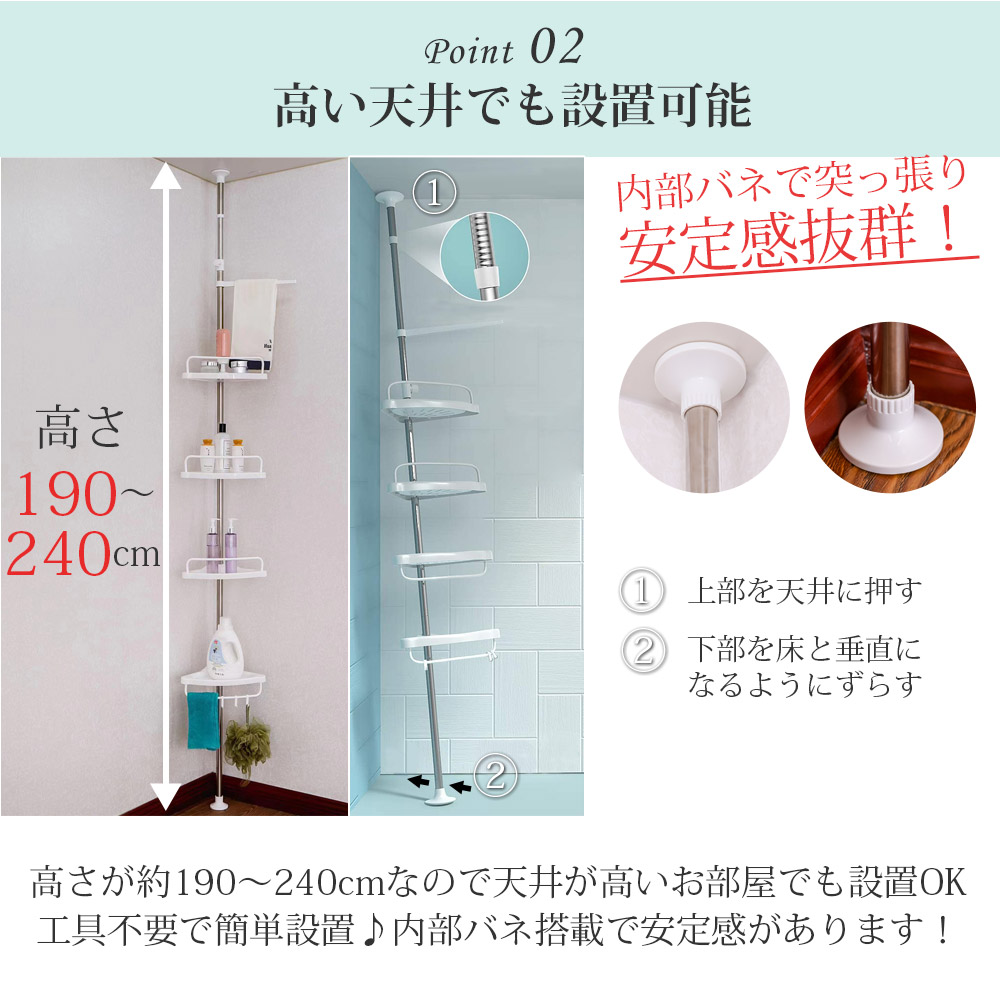 工具不要で簡単設置♪内部にバネ搭載で突っ張りが強く、安定感があります!