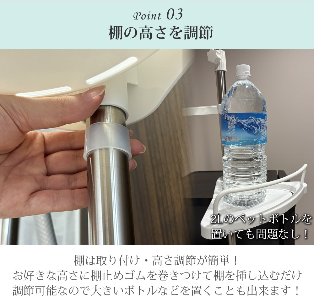 お好みの高さに調節可能なので大きいボトルなどを置くことも出来ます!
