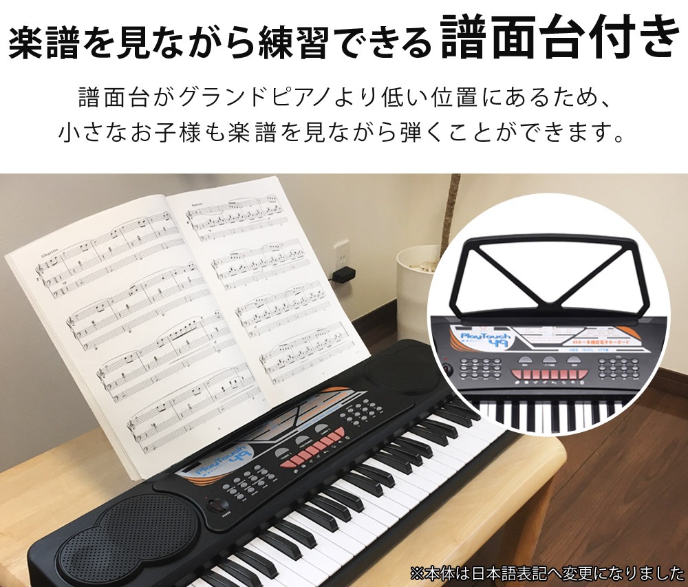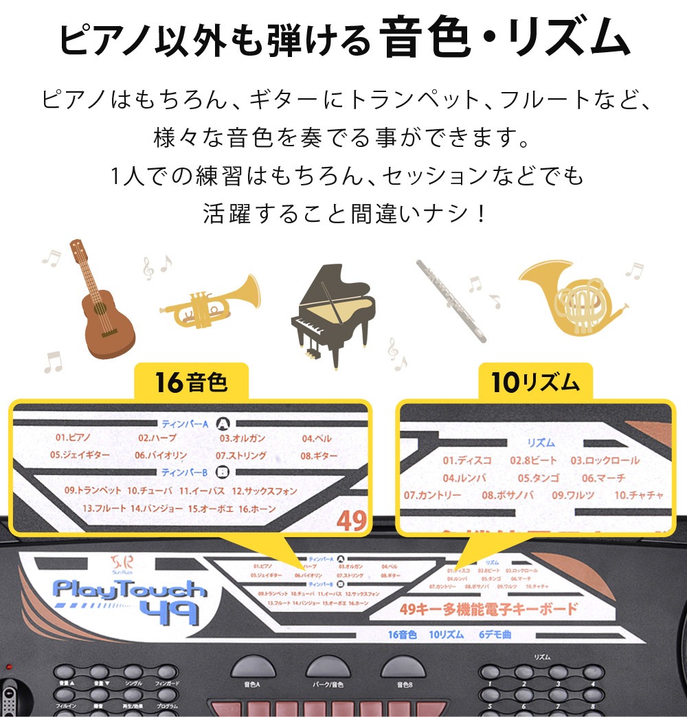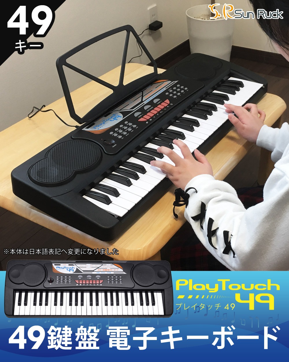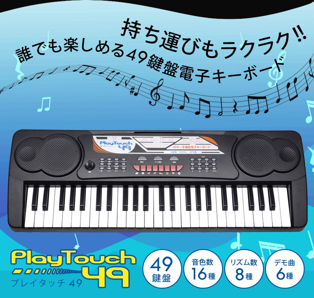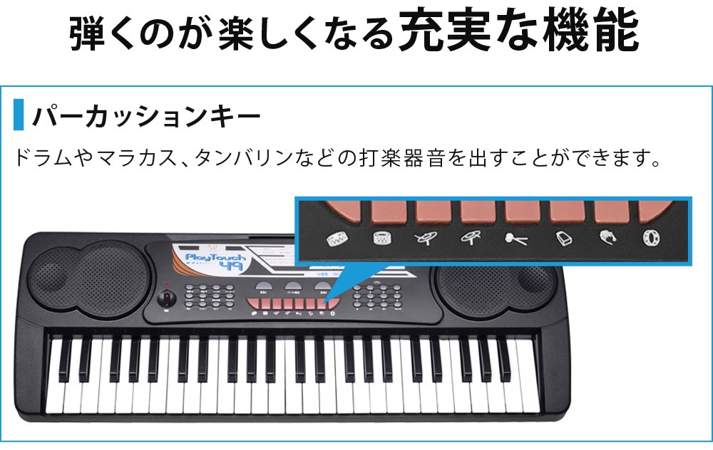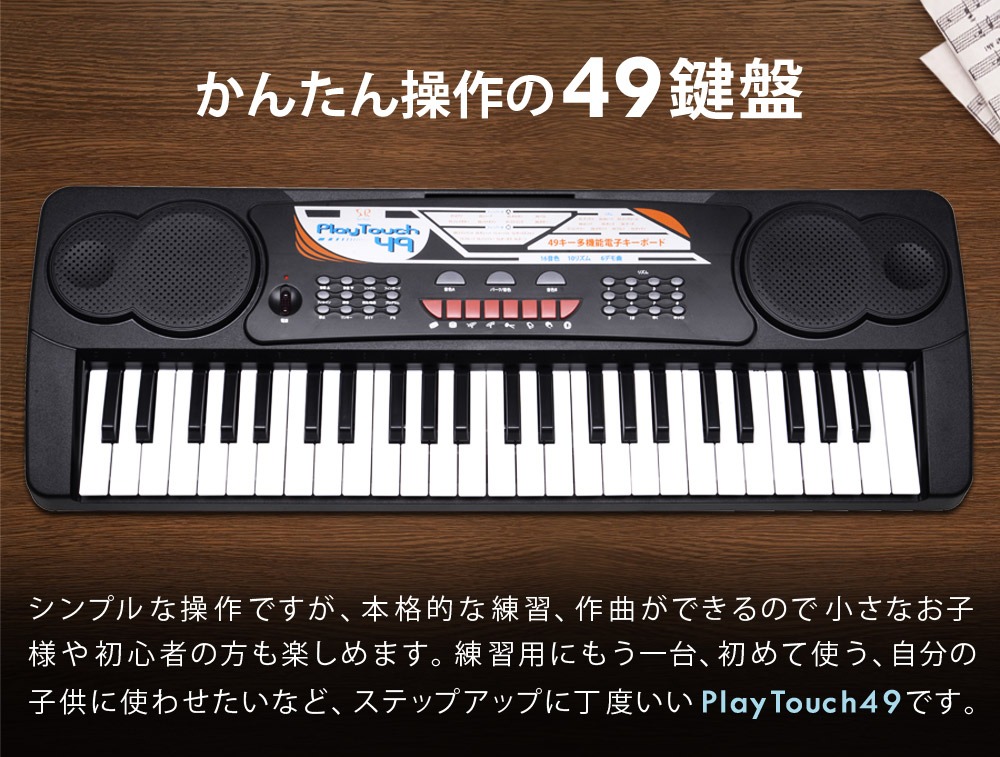 電子キーボード 49鍵盤 日本語表記 電子ピアノ AC/乾電池駆動 持ち運べる 楽器 自動伴奏 録音 プログラミング スリープ機能 ヘッドホン対応 音楽 練習 玩具 初心者 子供 キッズ 新学期 入学祝い PlayTouch49 SunRuck