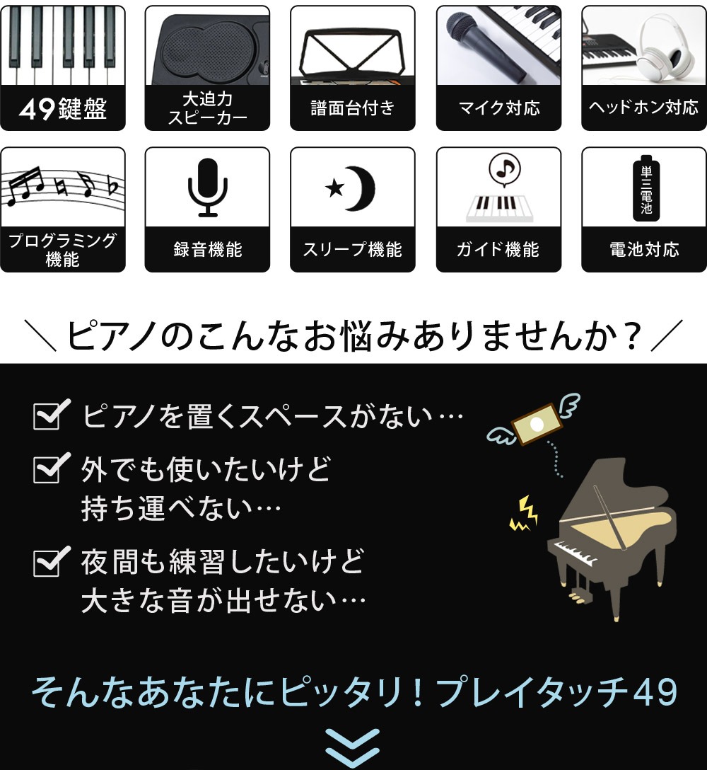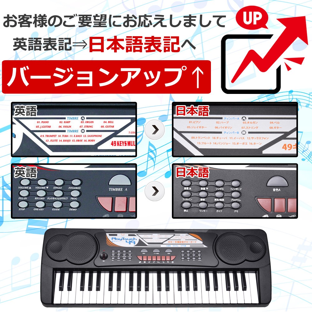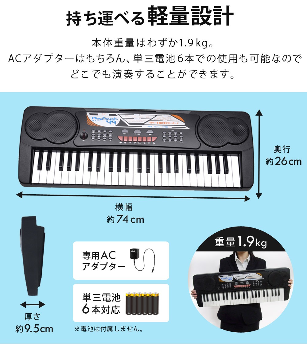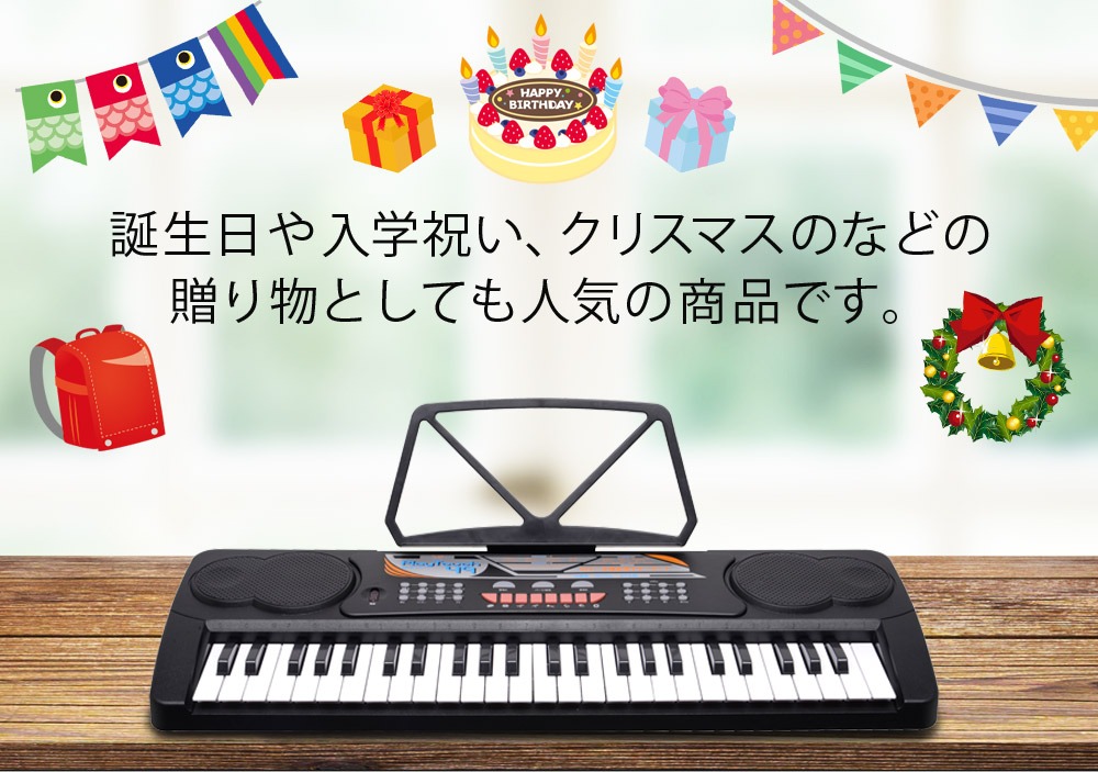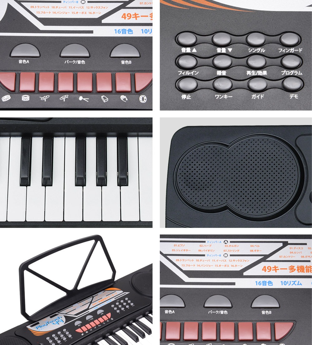 電子キーボード 49鍵盤 日本語表記 電子ピアノ AC/乾電池駆動 持ち運べる 楽器 自動伴奏 録音 プログラミング スリープ機能 ヘッドホン対応 音楽 練習 玩具 初心者 子供 キッズ 新学期 入学祝い PlayTouch49 SunRuck
