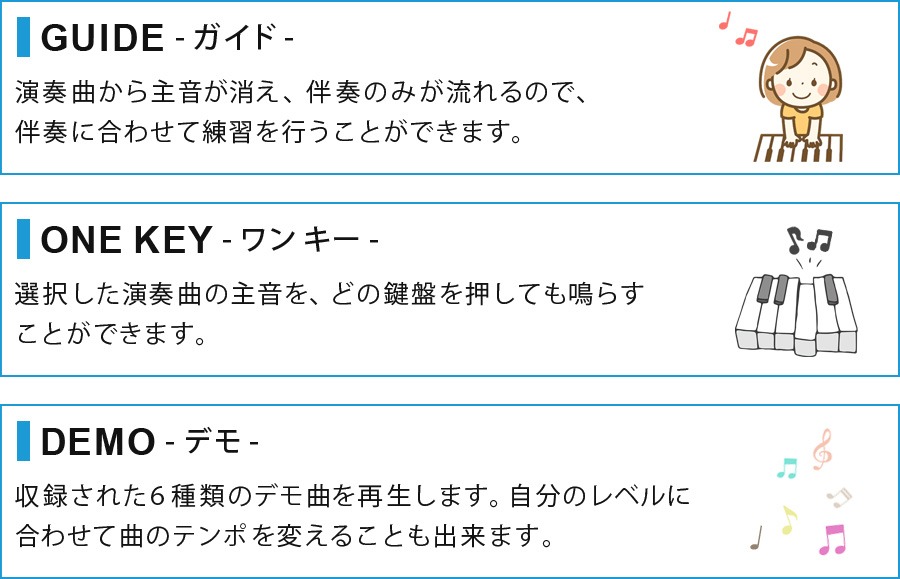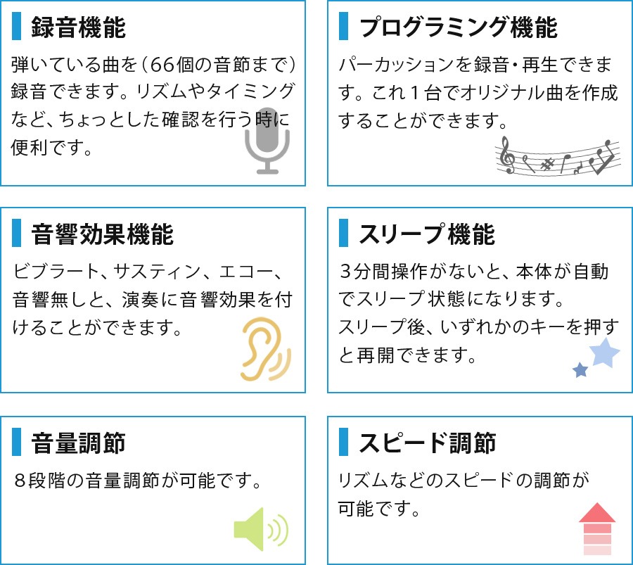 キーボードパーカッション、録音機能、プログラミング機能、音響効果機能、スリープ機能、音量調節、スピード調節
