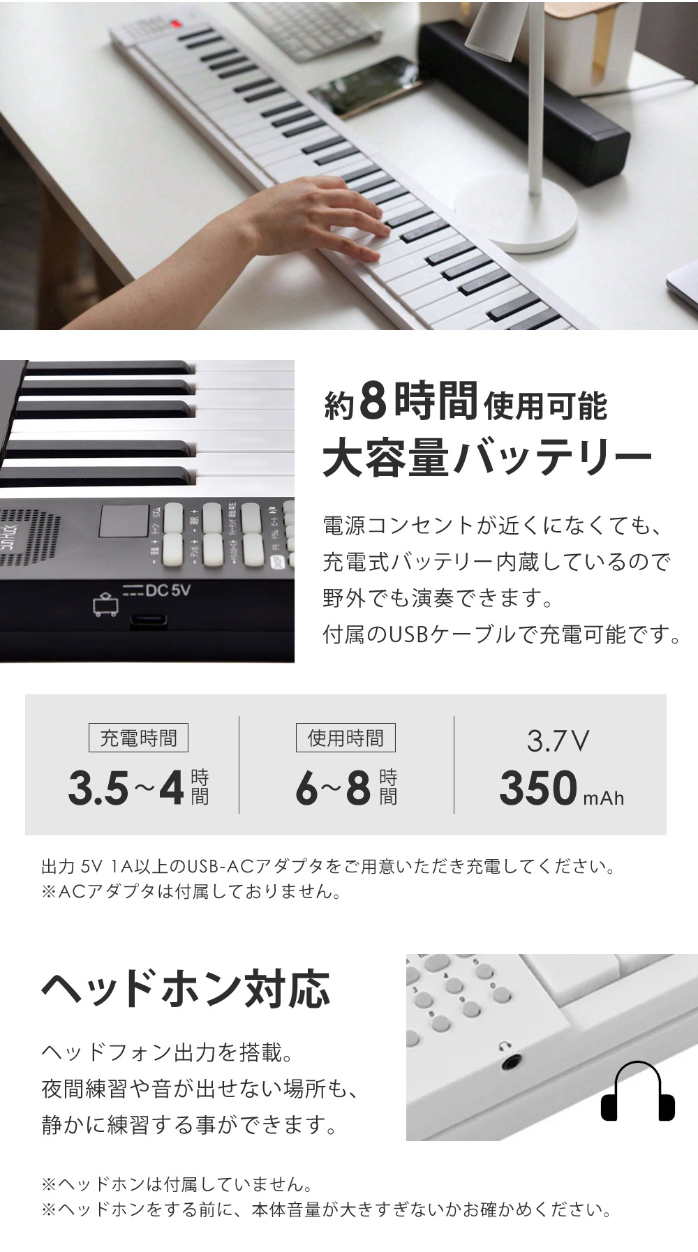 電源コンセントが近くになくても、充電式バッテリー内蔵しているので野外でも演奏できます。付属のUSBケーブルで充電可能です。
