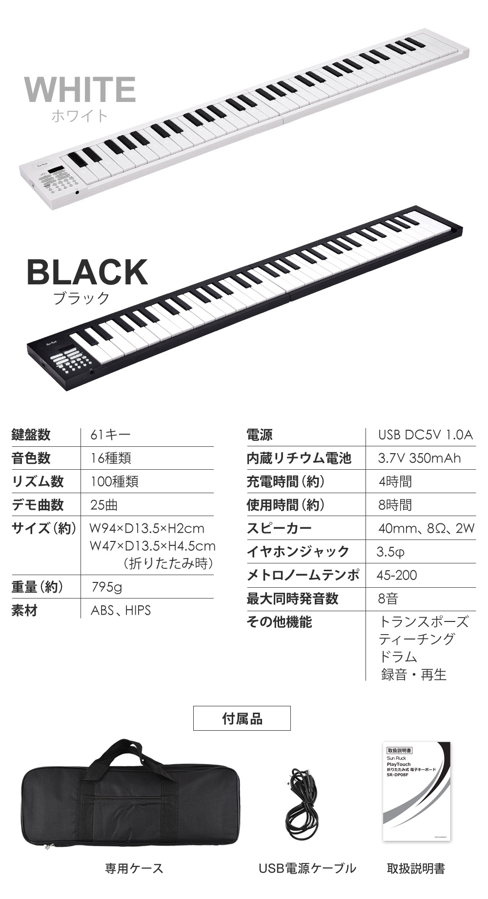 電子ピアノ 折りたたみ 61鍵盤 日本語表記 充電式 ワイヤレス 入門用 初心者 大人 子供 電子キーボード 電子 ピアノ キーボード 折りたたみ式 折り畳み 練習 楽器 録音 再生 リズム 音色 自動伴奏 スリム Sunruck SR-DP08F[ブラック]