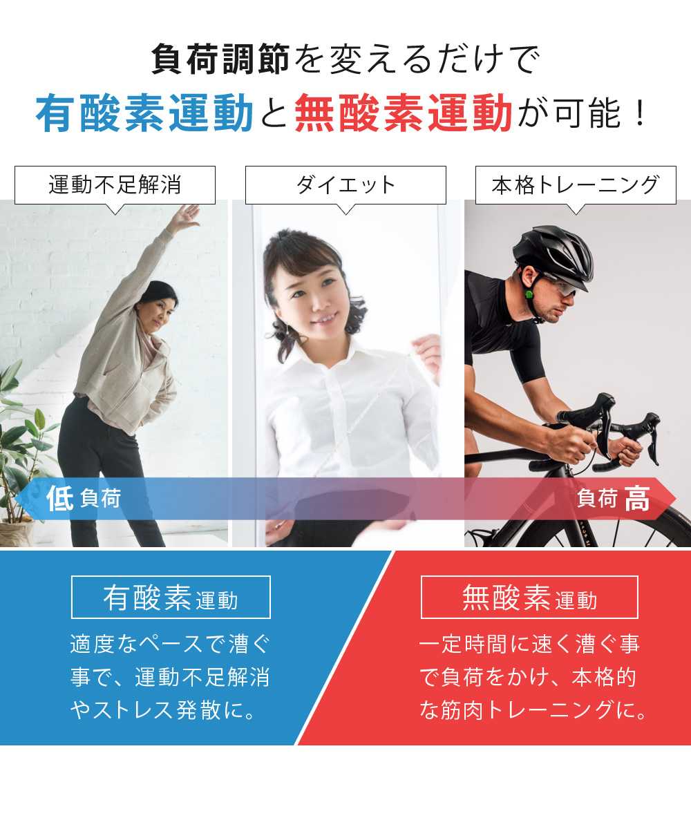 負荷調節を変えるだけで有酸素運動と無酸素運動が可能!