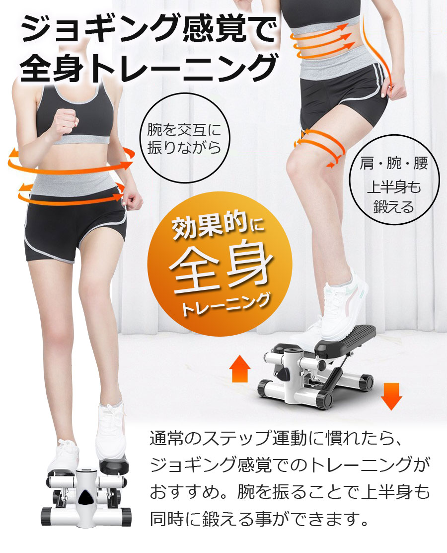 通常のステップ運動に慣れたら、 ジョギング感覚でのトレーニングが おすすめ。腕を振ることで上半身も同時に鍛える事ができます。