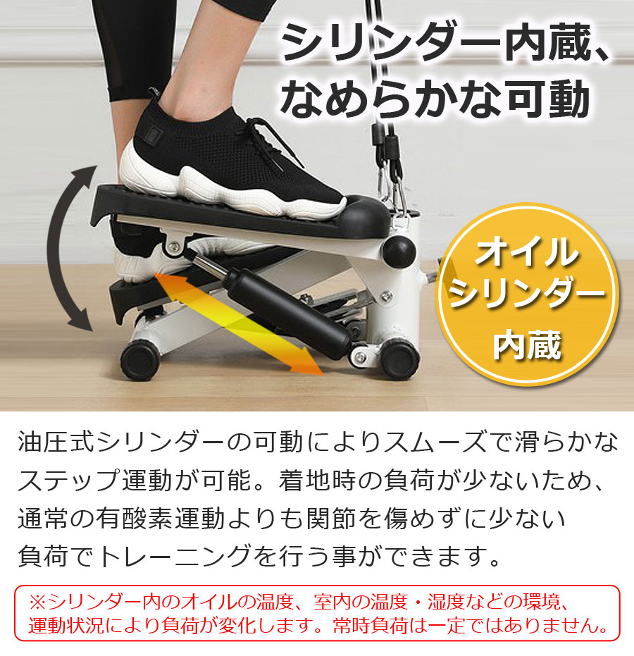 油圧式シリンダーの可動によりスムーズで滑らかなステップ運動が可能。着地時の負荷が少ないため、通常の有酸素運動よりも関節を傷めずに少ない負荷でトレーニングを行う事ができます。