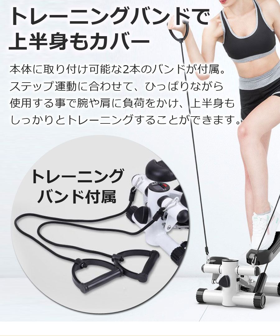 本体に取り付け可能な2本のバンドが付属。ステップ運動に合わせて、ひっぱりながら使用する事で腕や肩に負荷をかけ、上半身もしっかりとトレーニングすることができます。