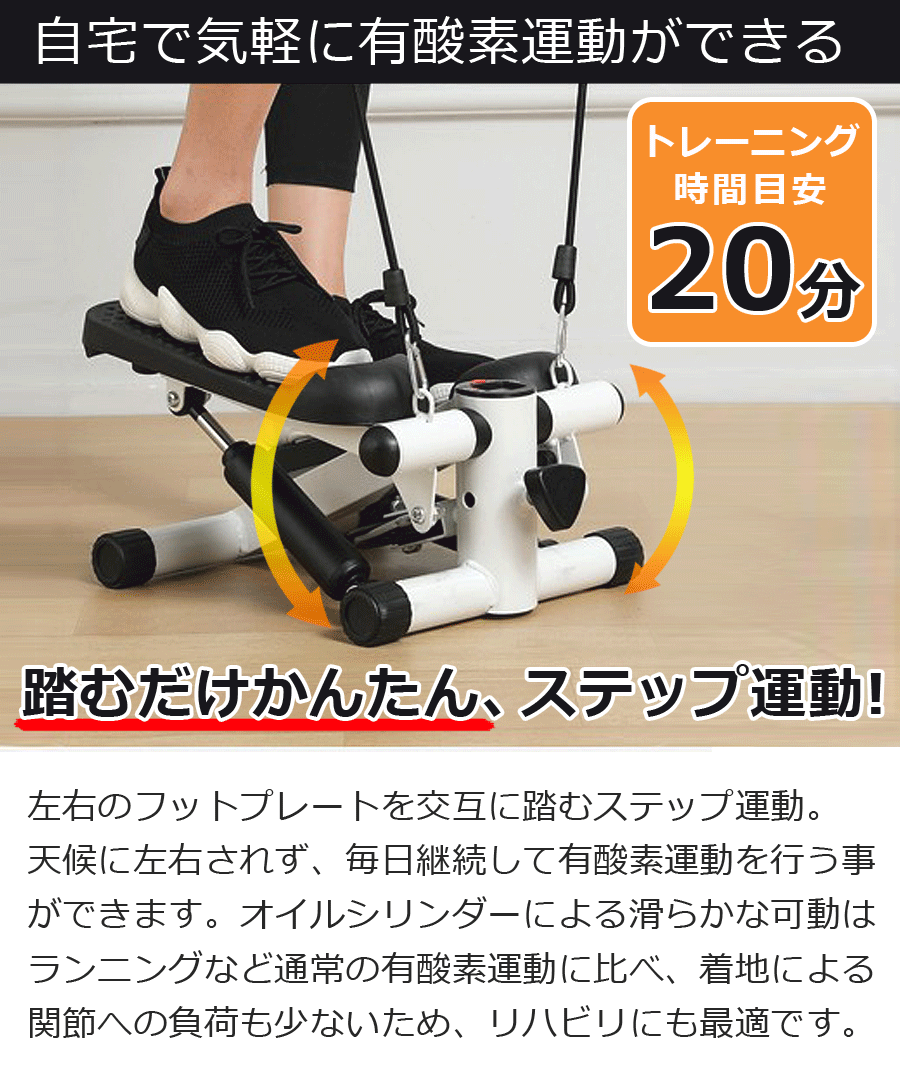 左右のフットプレートを交互に踏むステップ運動。 天候に左右されず、毎日継続して有酸素運動を行う事ができます。オイルシリンダーによる滑らかな可動はランニングなど通常の有酸素運動に比べ、着地による関節への負荷も少ないため、リハビリにも最適です。