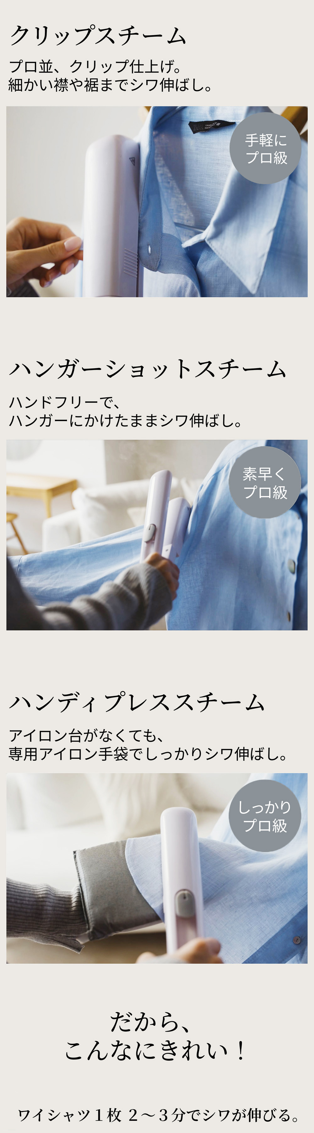 スチームでシワを伸ばし、アイロンがけの後に気持ちよく着られます。