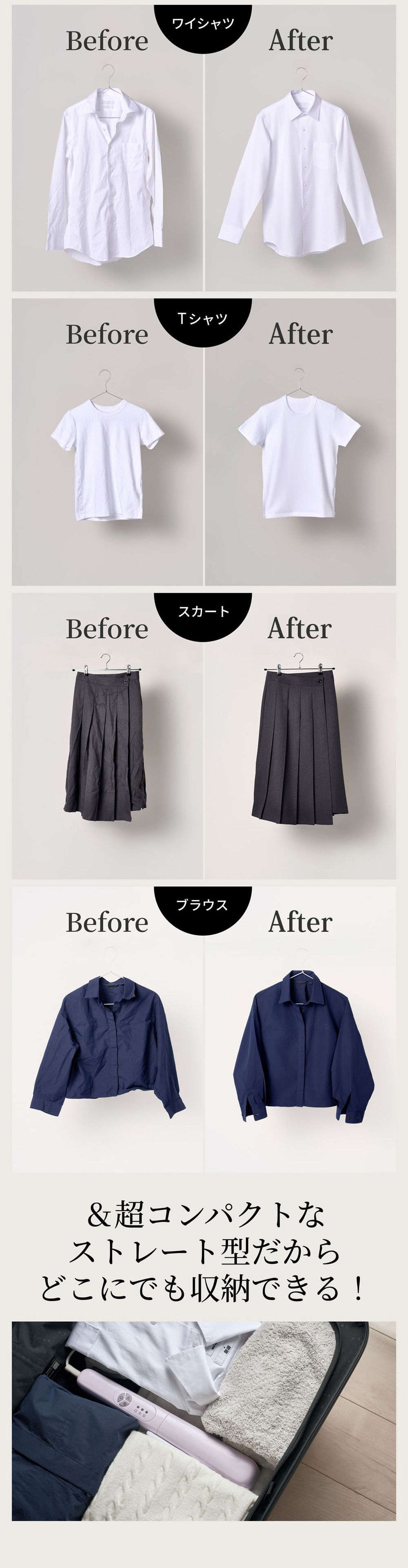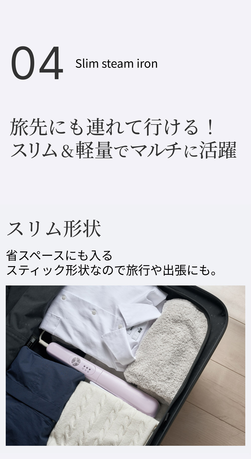軽量・コンパクトだから、旅先でもプロ級仕上げのシワ伸ばし。