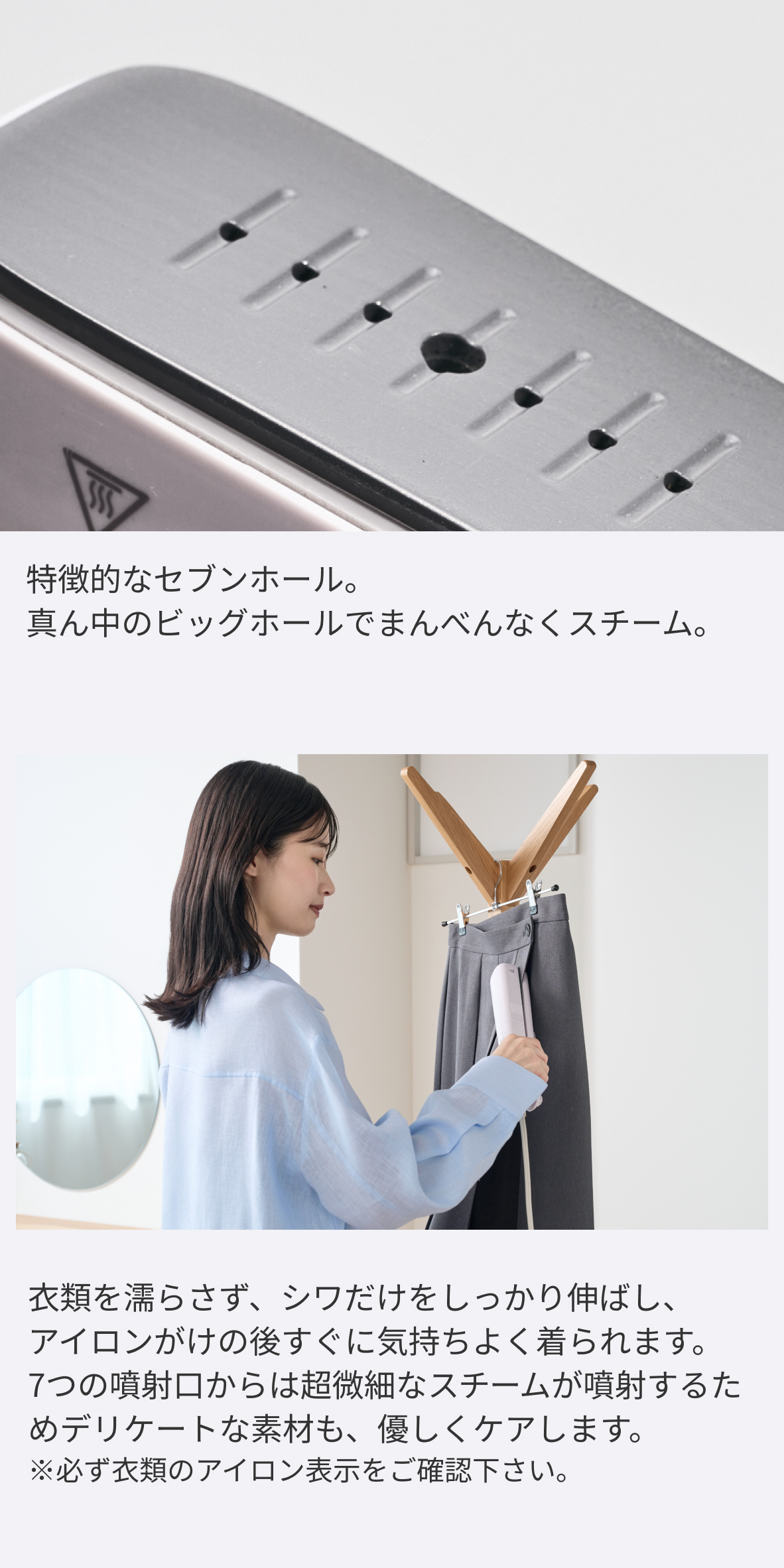 7つの噴射口からは超微細なスチームが噴射するためデリケートな素材も、優しくケアします。