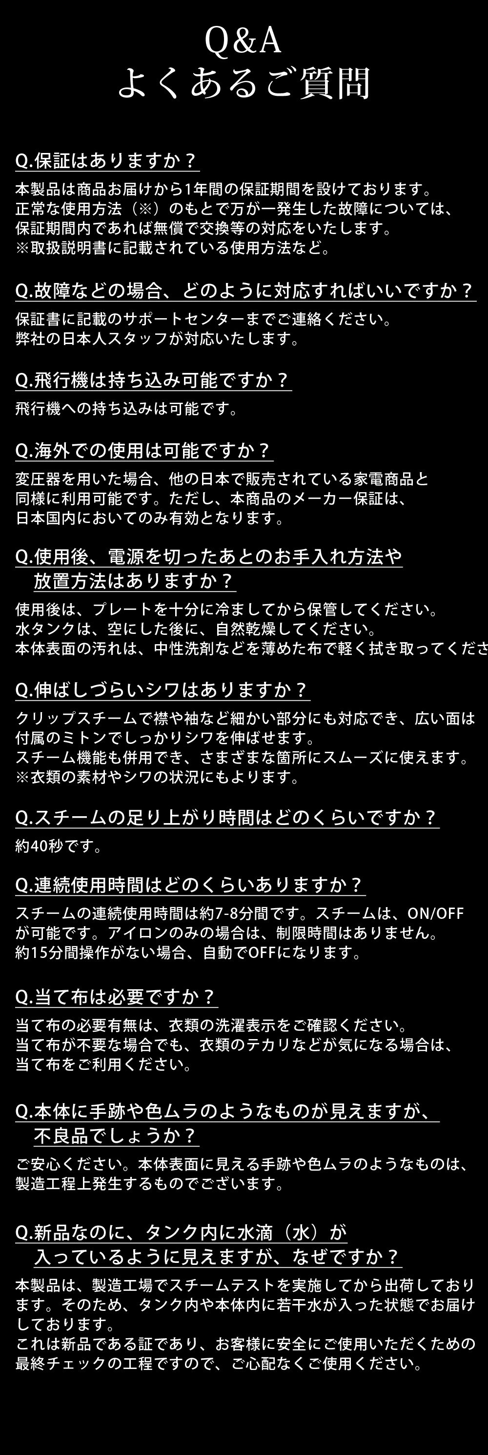 ※製造工場にて、安全性・正常動作を確認するため、出荷前にスチーム噴射の動作確認テストを実施しており、その工程上、タンク内にわずかな水分が残った状態でお届けとなる場合がございます。