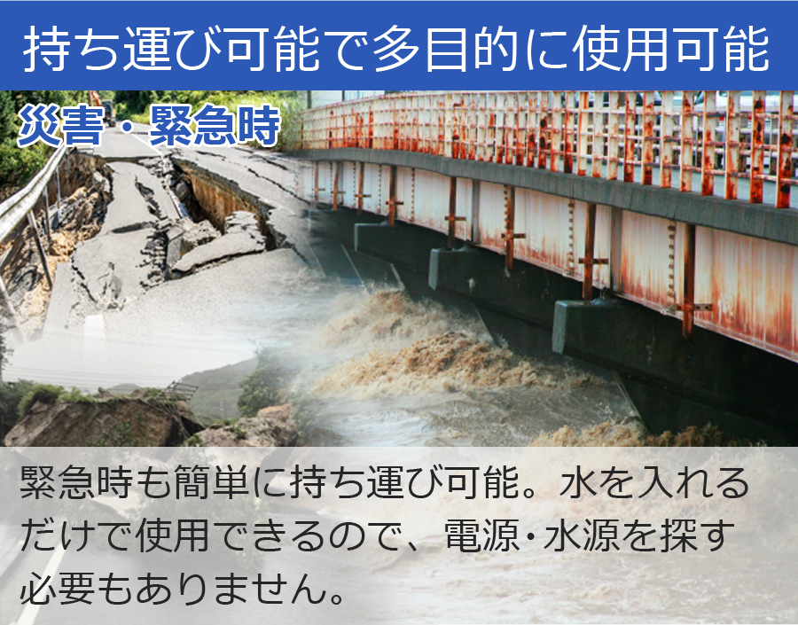 緊急時も簡単に持ち運び可能。 水を入れるだけで使用できるので、電源・水源を探す必要もありません。