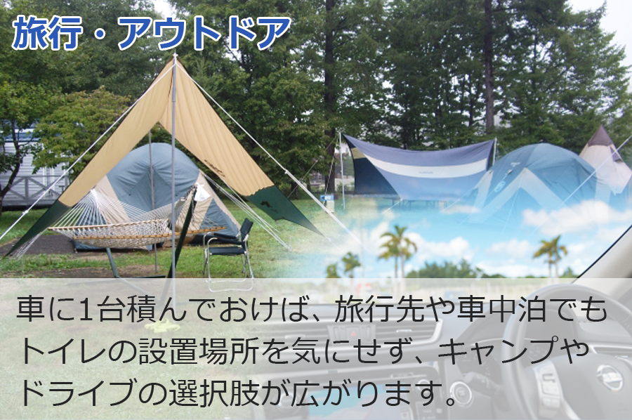 車にー台積んでおけばヽ 旅行先や車中泊でも卜イレの設置場所を気にせず、キャンプやドライブの選択肢が広がります。