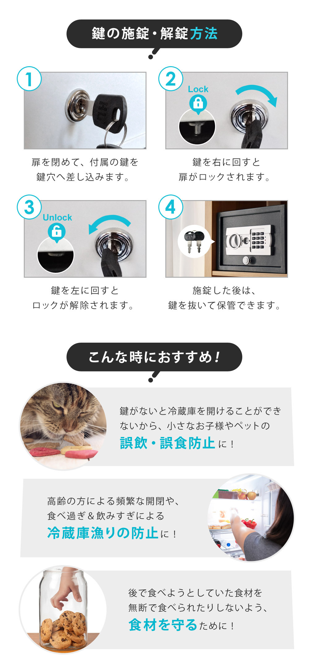 扉をロックし、イタズラやケガなどを防ぐ鍵付き冷蔵庫。