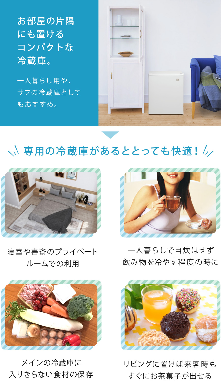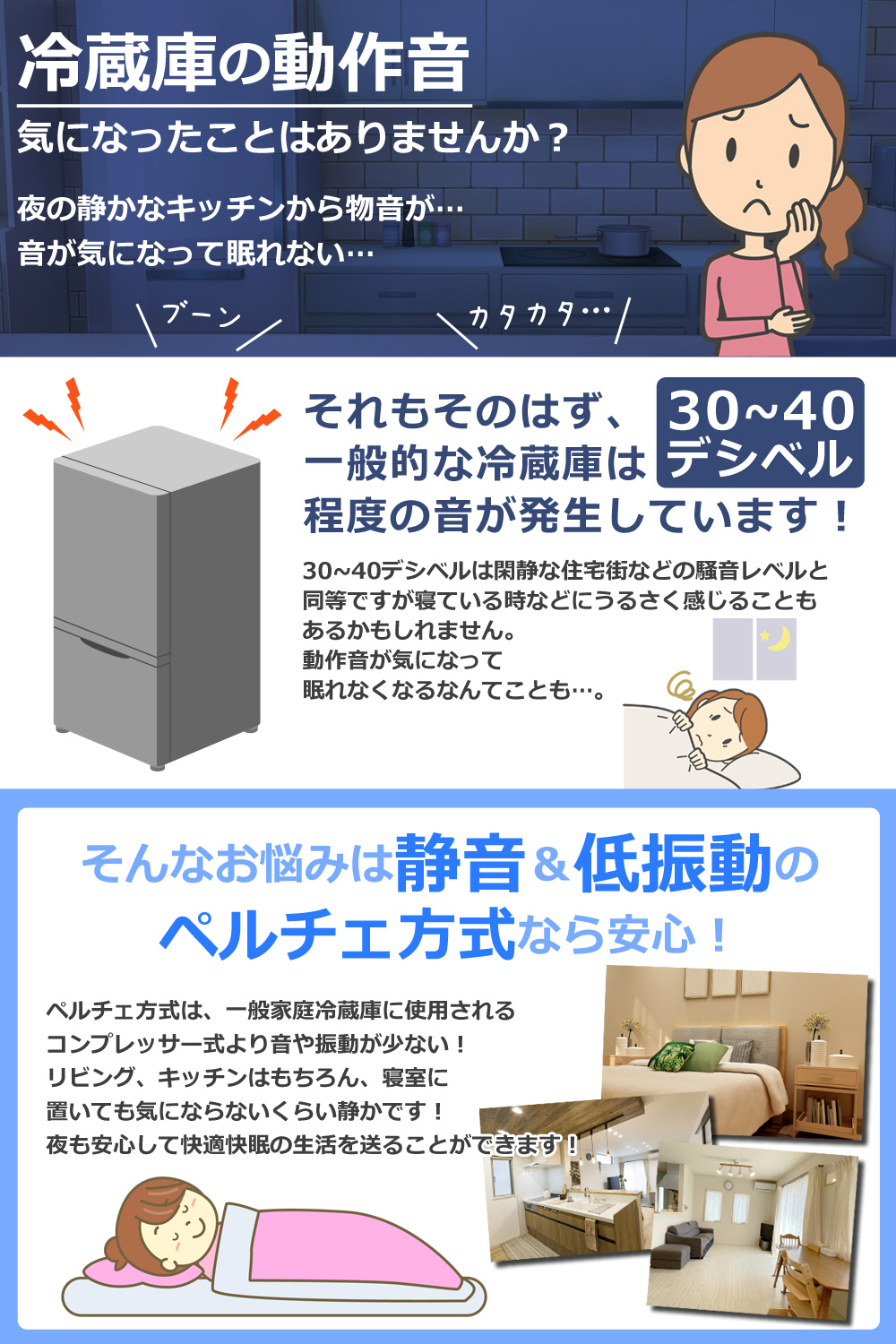 コンパクトサイズだからせまいスペースや静寂性の高い寝室など、今まで冷蔵庫が置けなかったちょっとした場所に使えます!