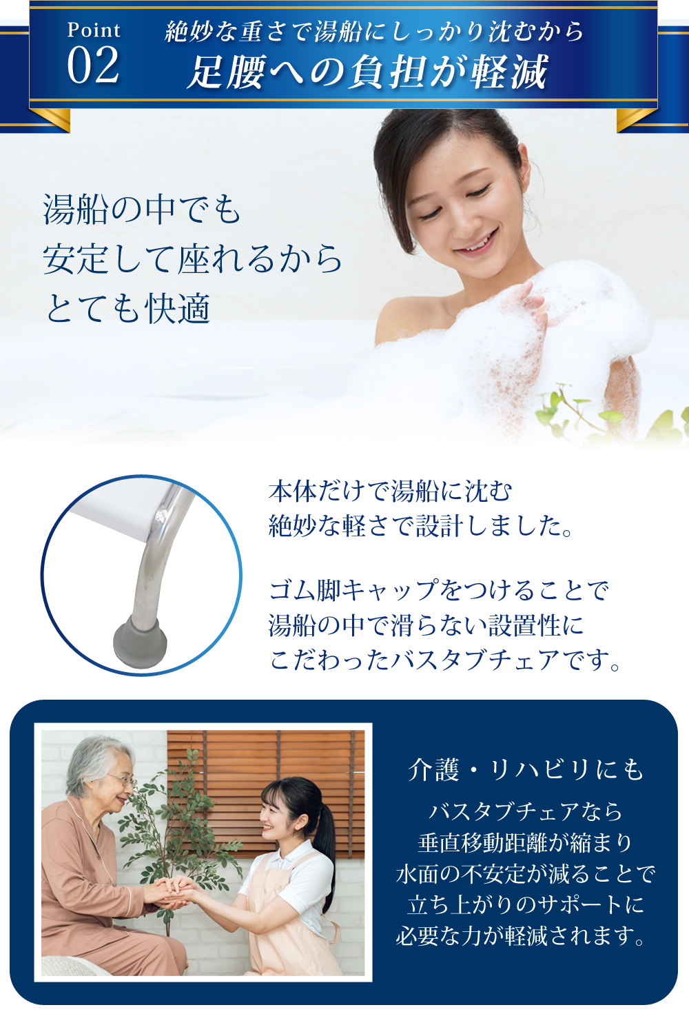 浴槽の中で座れる座椅子として、入浴時の足腰への負担を軽減します。