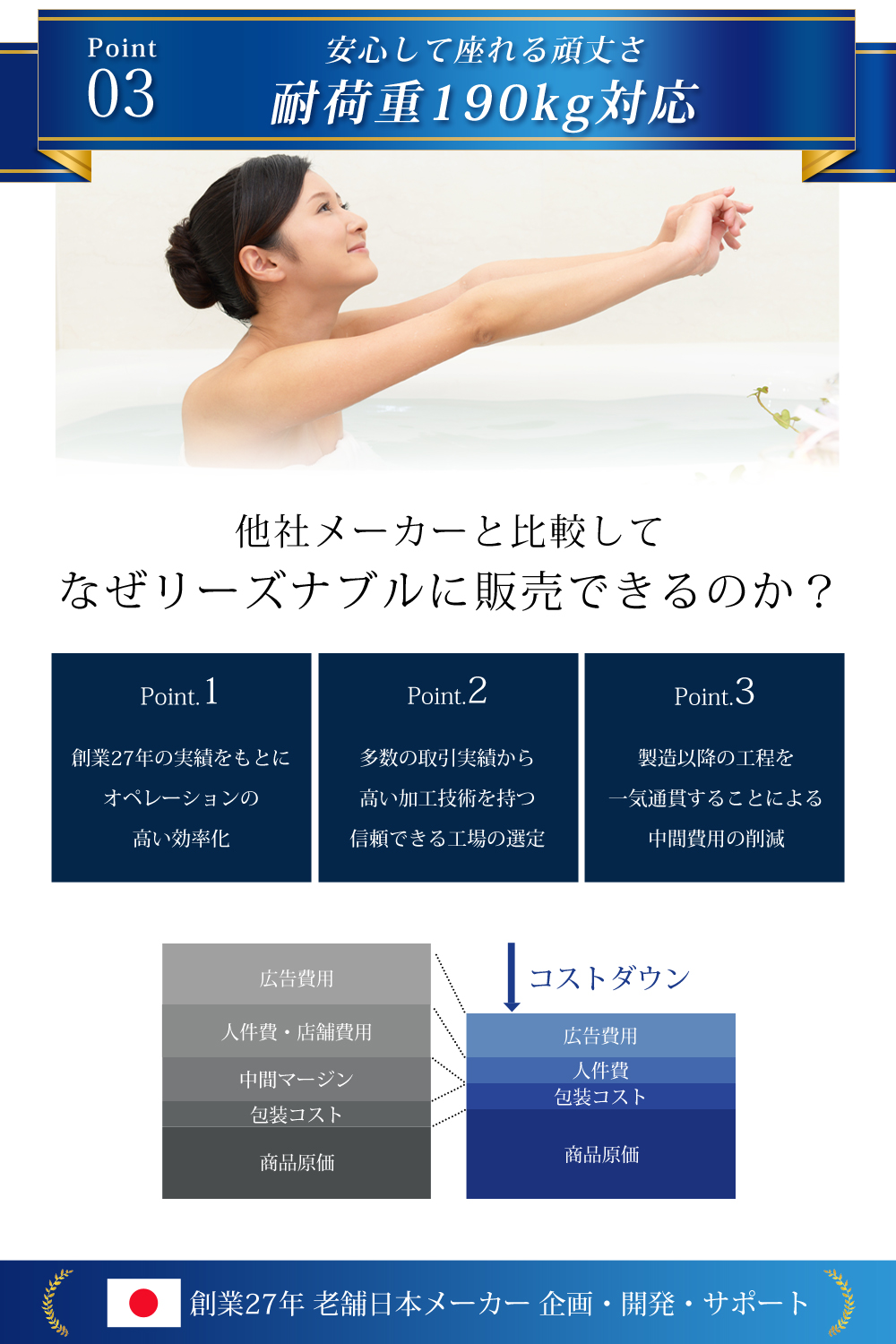 長時間湯船に浸かるときにも便利。、浴槽に直接座るよりも快適な半身浴を行うことができます。