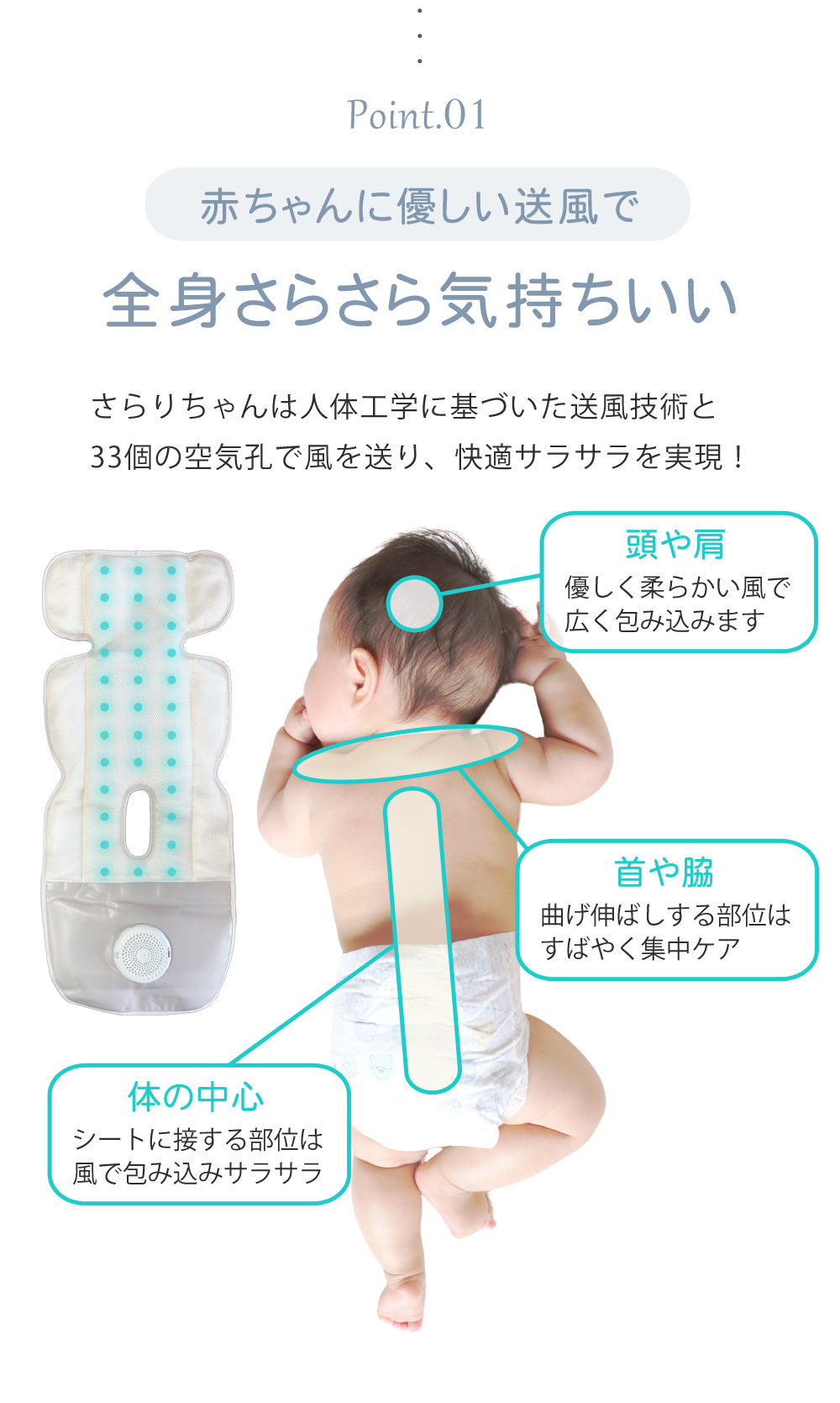 さらりちゃんは人体工学に基づいた送風技術と33個の空気孔で風を送り、快適サラサラを実現!