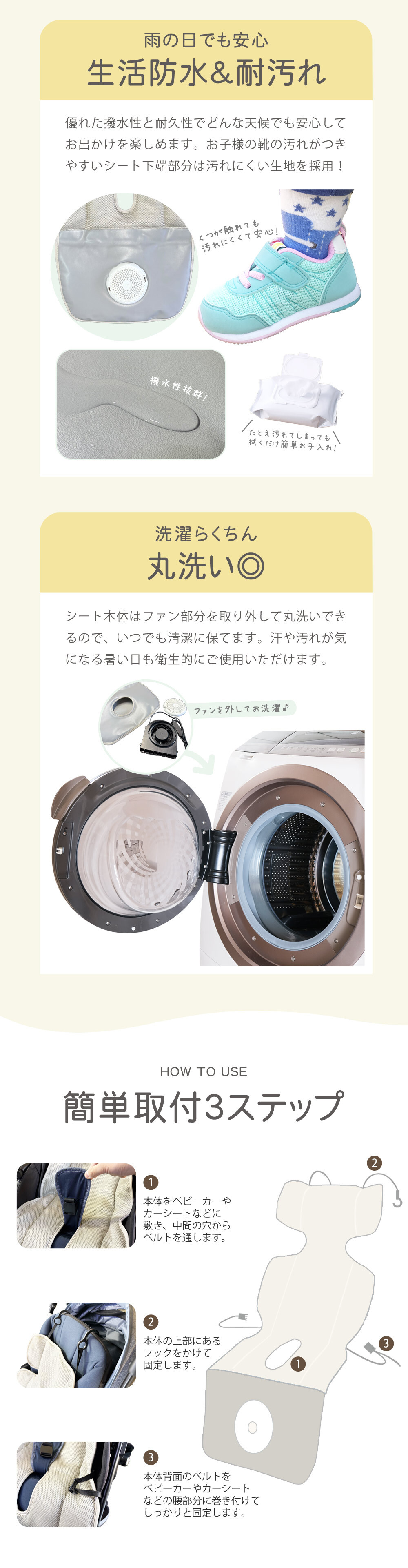 シート本体はファン部分を取り外して丸洗いできるので、いつでも清潔に保てます。