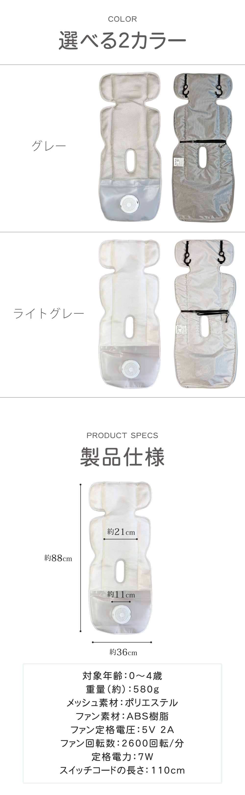 ファン付きベビーカーシート チャイルドシート ファン付き ベビーシート 暑い日も涼しく快適 カー用品 ベビー用品 車載 熱中症対策 Sunruck SR-SCP-08[ライトグレー]