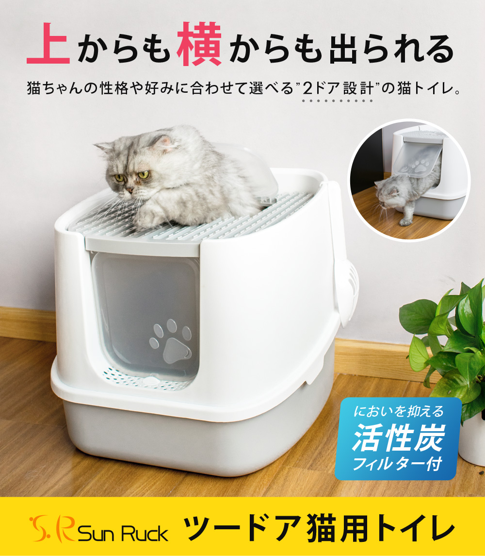 ツードア猫トイレ 本体 フルカバー 2ドア 猫 トイレ 大きい 活性炭フィルター付き スコップ付き 飛び散り防止 散らかりにくい 砂落とし 蓋付き 扉付き 上から 横から おしゃれ Sunruck ニャンと安心!猫トイレ