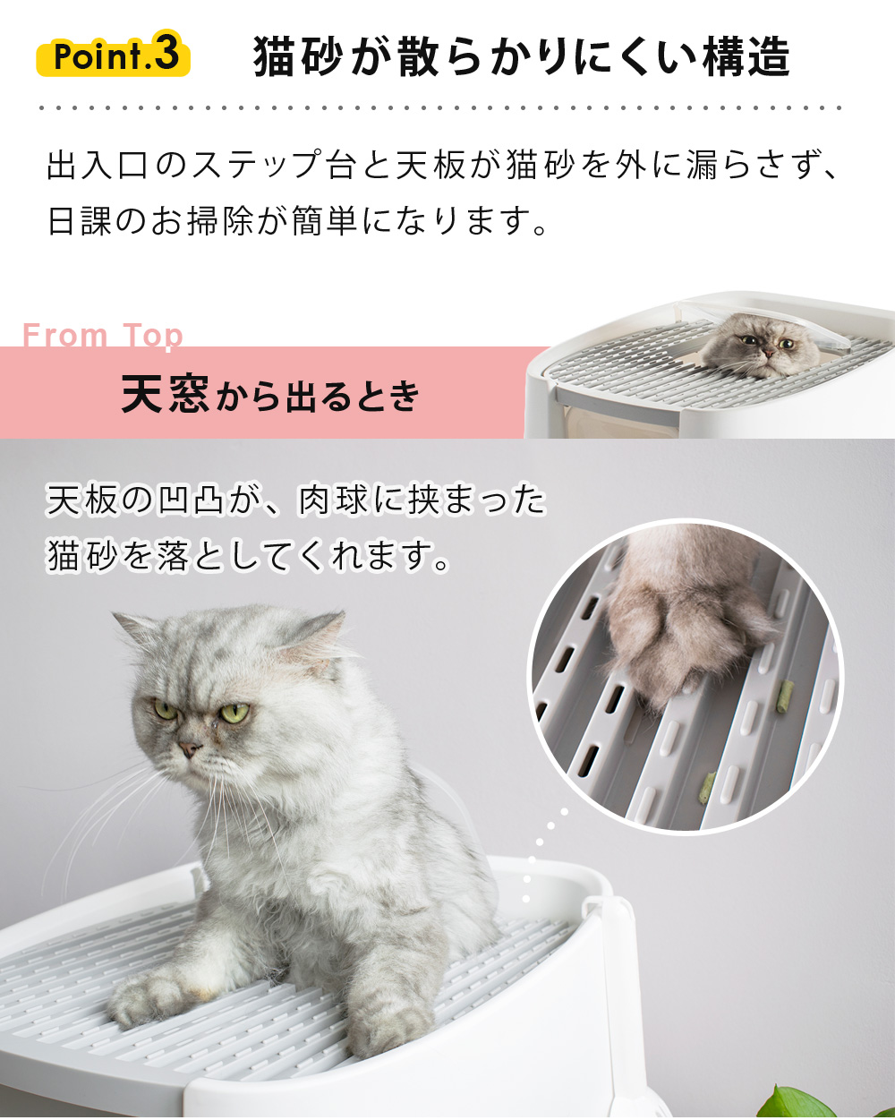 出入口のステップ台と天板が猫砂を外に漏らさず、日課のお掃除が簡単になります。