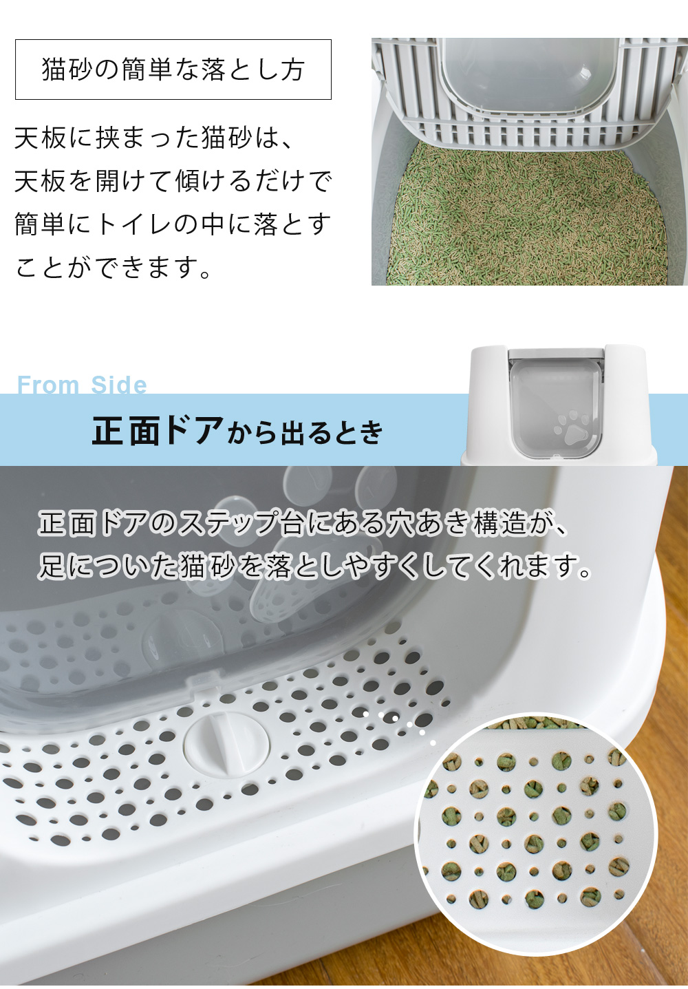 正面ドアのステップ台にある穴あき構造が、足についた猫砂を落としやすくしてくれます。