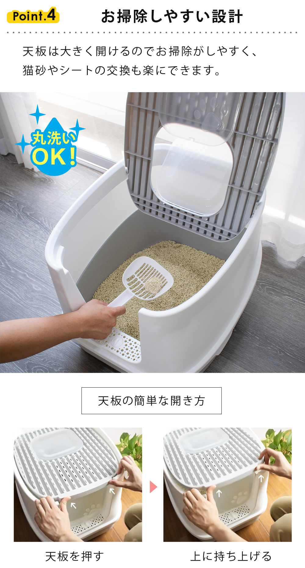 天板は大きく開けるのでお掃除がしやすく、猫砂やシートの交換も楽にできます。