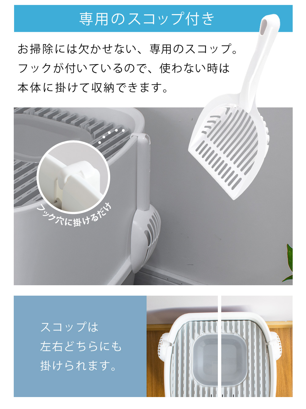 お掃除には欠かせない、専用のスコップ。フックが付いているので、使わない時は本体に掛けて収納できます。