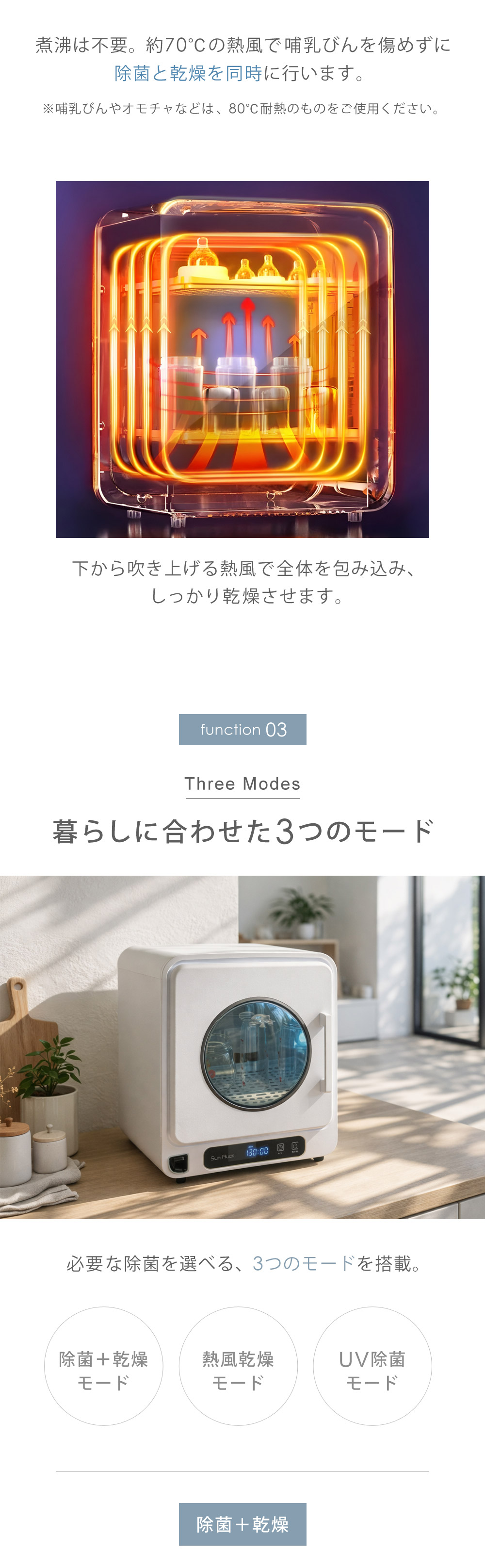 煮沸は不要。約70℃の熱風で哺乳びんを傷めずに除菌と乾燥を同時に行います。